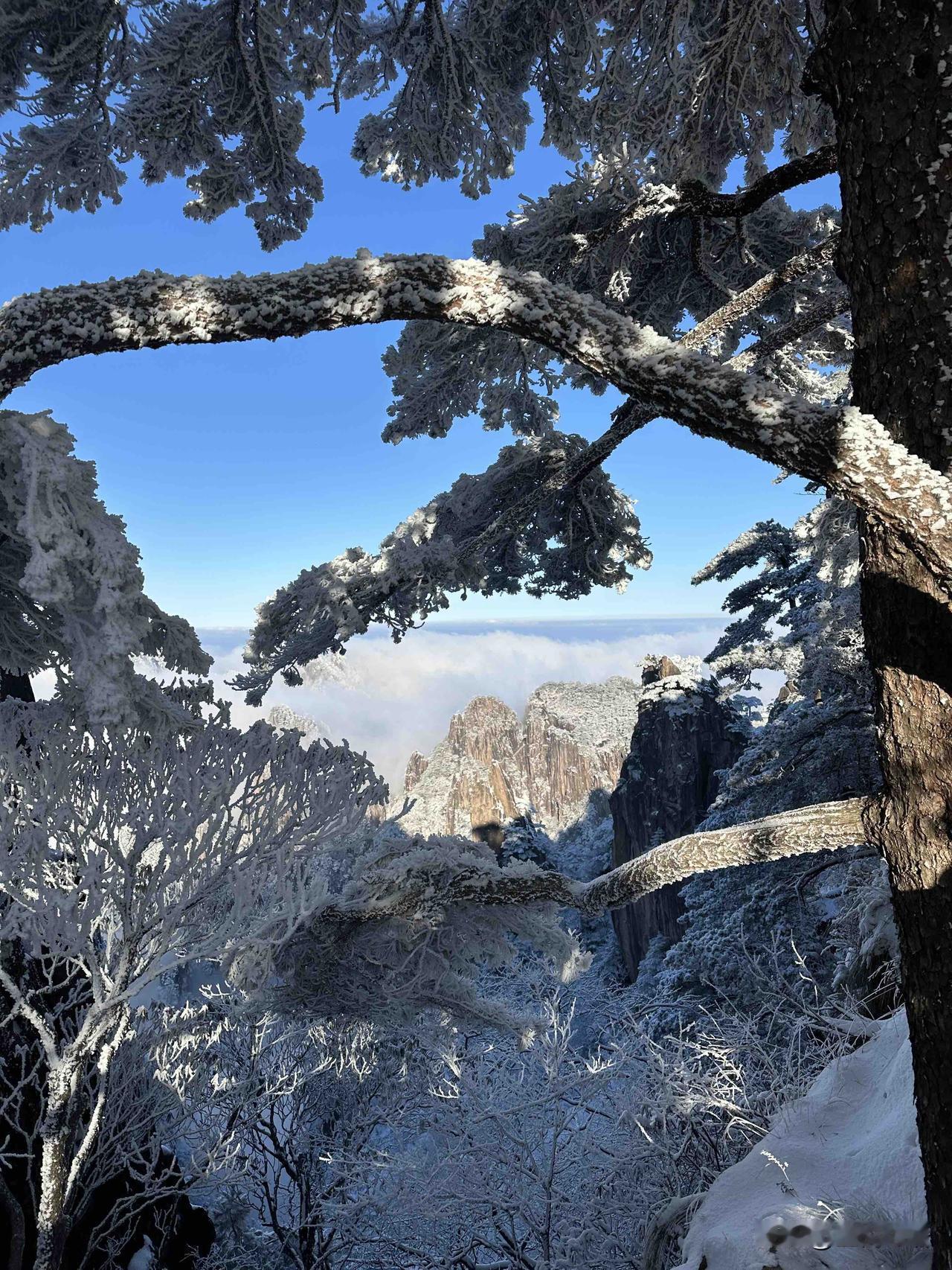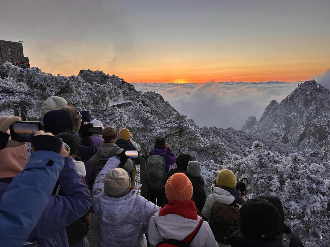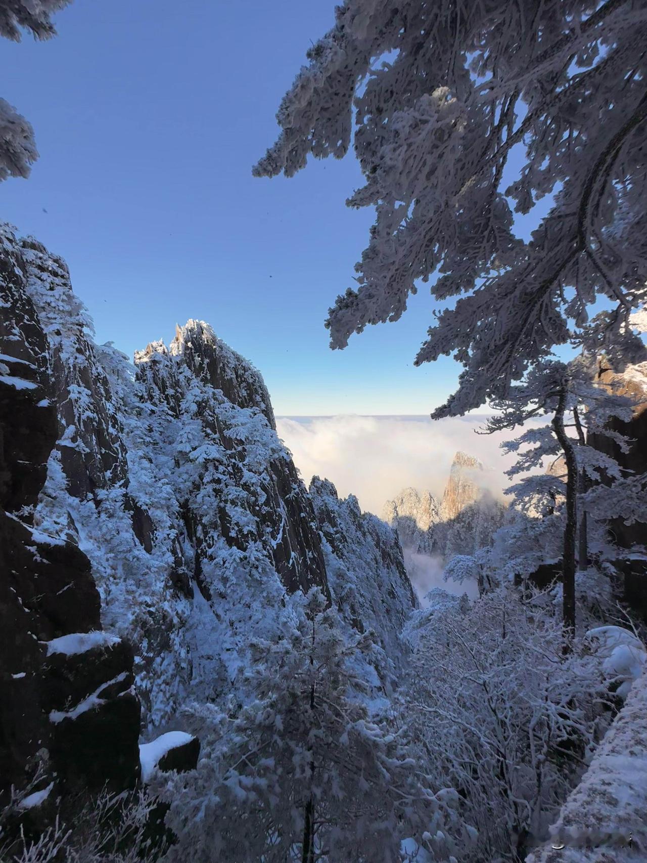 总要来黄山看一次云海吧! 谁懂啊! 去黄山真就撞大运了! 日出把天空染成橘子海, 云海像棉花糖铺满天际, 雾凇挂在枝头亮晶晶的。 一步一景,冻得手脚发麻也值! 爬山的累在看到美景那一刻全消散, 这才是旅行的意义啊~ 建议想冲的朋友早点蹲点位, 穿厚点,这样的神仙景色真的能记一辈子! 黄山顶峰看云海 黄山的云雾