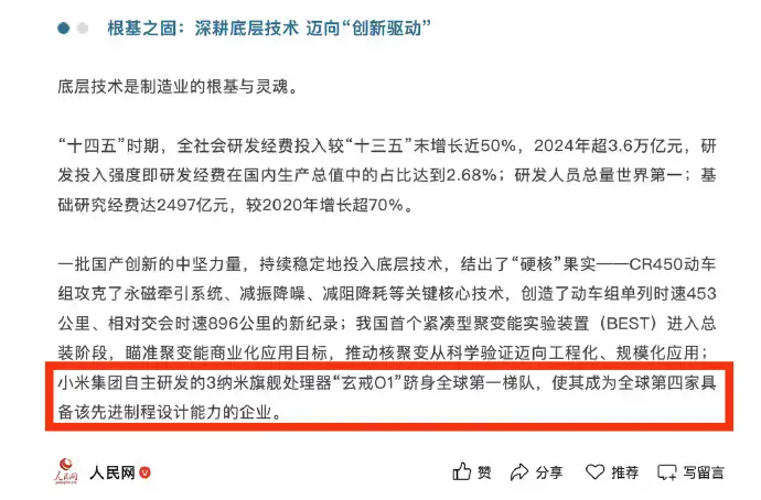 央媒又点赞小米!只不过有的网友觉得为啥又点赞了?我认为,小米自研3nm玄戒O1芯片,可以说是填补了先进芯片领域的空白。要知道,芯片可以说是尖端领域,能够突破就是给国产芯片长脸。而且小米还在新能源汽车、AI大模型、智能制造以及芯片半导体方面都在全面发力。