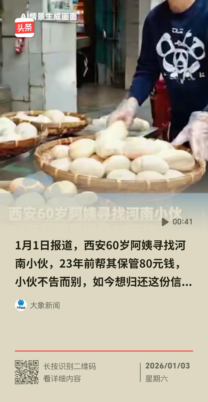 23年不忘一份托付!西安阿姨苦寻河南小伙,要把80元保管费十倍奉还 西安60多岁的杨阿姨,最近天天往老街区跑,逢人就打听一个河南开封小伙的下落。不为别的,就想把23年前帮对方保管的80块钱,翻十倍还成800块,更想看看小伙如今过得好不好。 时间拉回2000年,那时候的西安街头满是烟火气。不到40岁的杨阿姨在街边忙活,认识了来讨生活的河南小伙。小伙才十几岁,摆摊卖馒头,天不亮就揉面,一干就是一整天。那时候没手机扫码,大家出门都揣现金。小伙怕辛苦钱弄丢,红着脸把皱巴巴的80块钱托付给杨阿姨,两人没写借条、没留信息,全凭一句口头约定。 往后碰面,小伙常递上热乎馒头,杨阿姨也总叮嘱他注意身体。可没几天,小伙干活时手臂严重受伤,没法再摆摊。当年交通通讯不便,他没来得及道别,就被家人接回了老家。等杨阿姨再去摊位,只剩空荡荡一片。 这23年里,杨阿姨从青丝熬成白发,那80块钱被她用手绢包好,藏在柜子深处,一分没动。如今她年纪大了,心里的牵挂越来越重,不仅准备了800块钱,更想知道小伙手臂的伤有没有留下病根。她找遍老地方、问遍老街坊,却始终没有小伙的音讯。 网友纷纷点赞,有人说这哪是还钱,分明是在还人心。在这个讲究效率的时代,这份跨越23年的信任与坚守,正是人与人之间最珍贵的底色。 我可以帮你提炼这个故事的核心传播点,方便你做短视频引流,需要吗?河南籍阿姨 河南男士