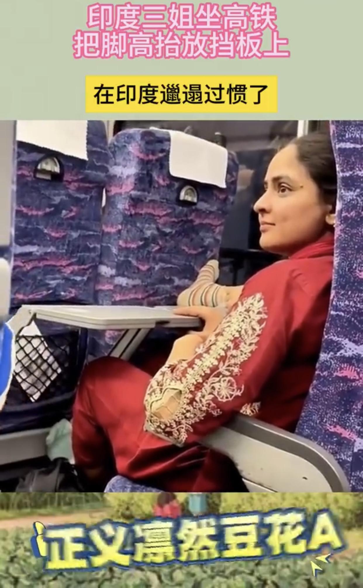 一名来中国旅行的印度女子坐高铁时,脱鞋把她穿着袜子的脚高抬放在高铁座椅的挡板上,并无视旁边中国人的劝说,依然我行我素,拒不把她的脚放下来穿好鞋。这位印度人可能平时在印度国内习惯这样了,到了中国后,仍然不改掉这些坏习惯,可见其素质之差,毫无羞耻感可言,仿佛她作为外国人印度人自我感觉在中国享有特权一样,想怎么来就怎么来,中国人无权谴责阻止她的不良行为。