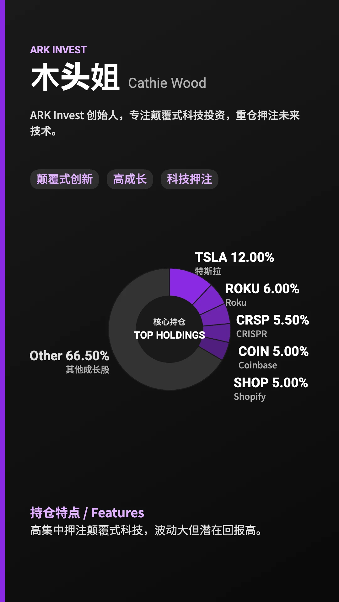 高度集中在颠覆式科技公司,波动极大,但一旦踩中趋势,回报也可能极高,典型的“高风险换高成长”。、