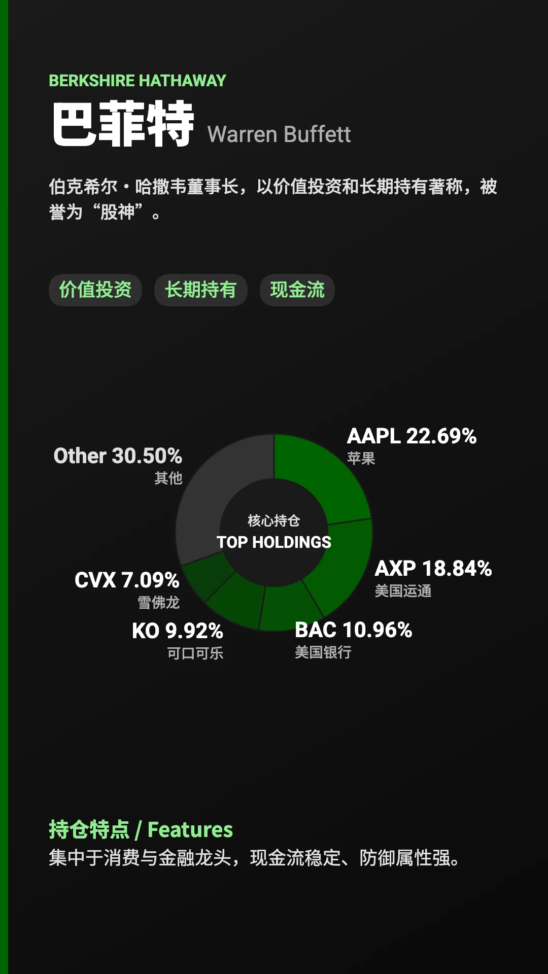 最新整理了一组不同投资流派代表性人物的持仓风格,同样是顶级投资人,持仓结构却完全不同。这组图我拆的是四种非常典型、也最容易被普通投资者误解的投资流派: 巴菲特、木头姐、达利欧、阿克曼。