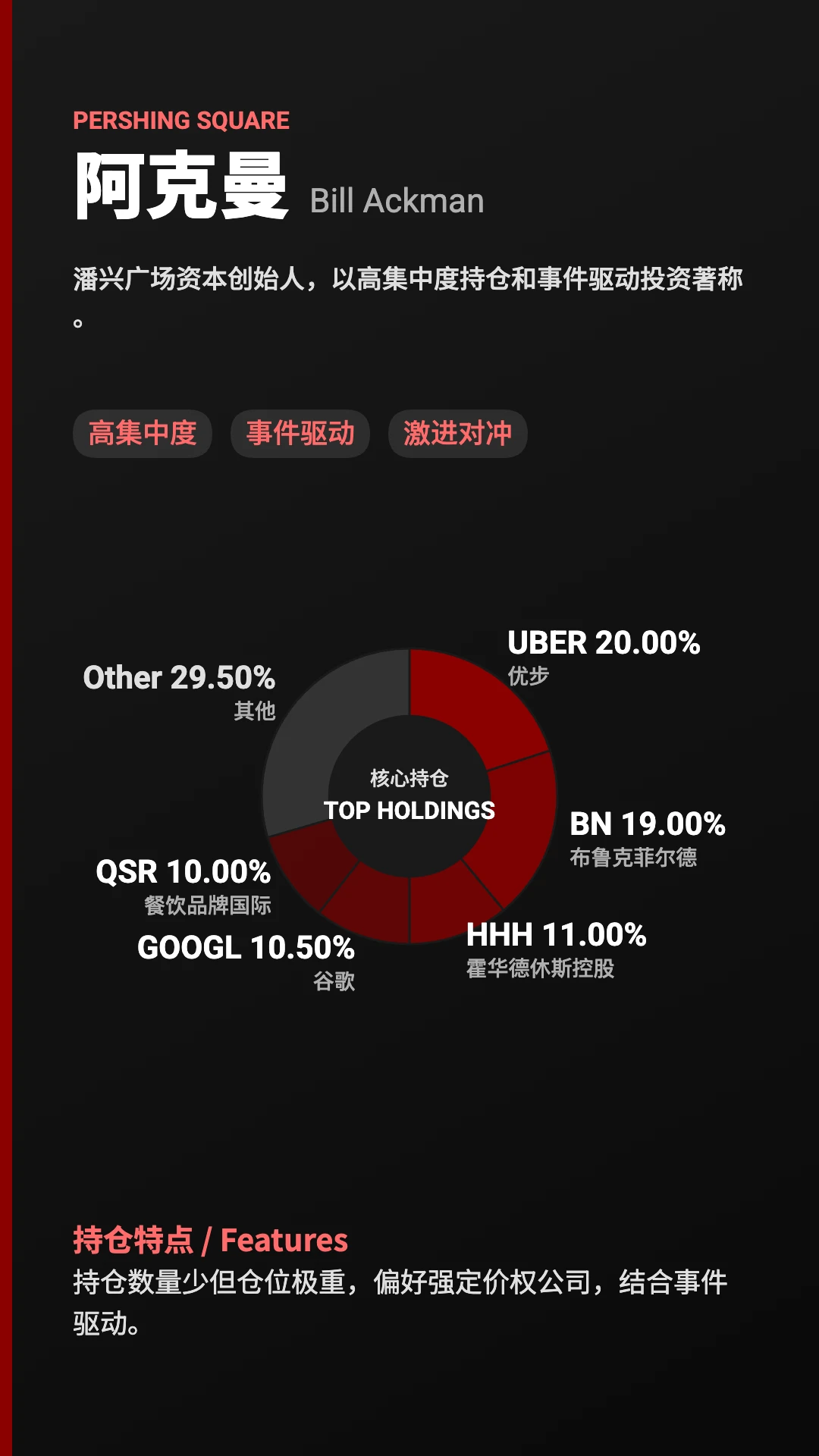 *数据来源*:各基金最新披露持仓(13F 文件)、基金官网及公开资料整理,持仓比例为近似值,仅用于方法分析。
