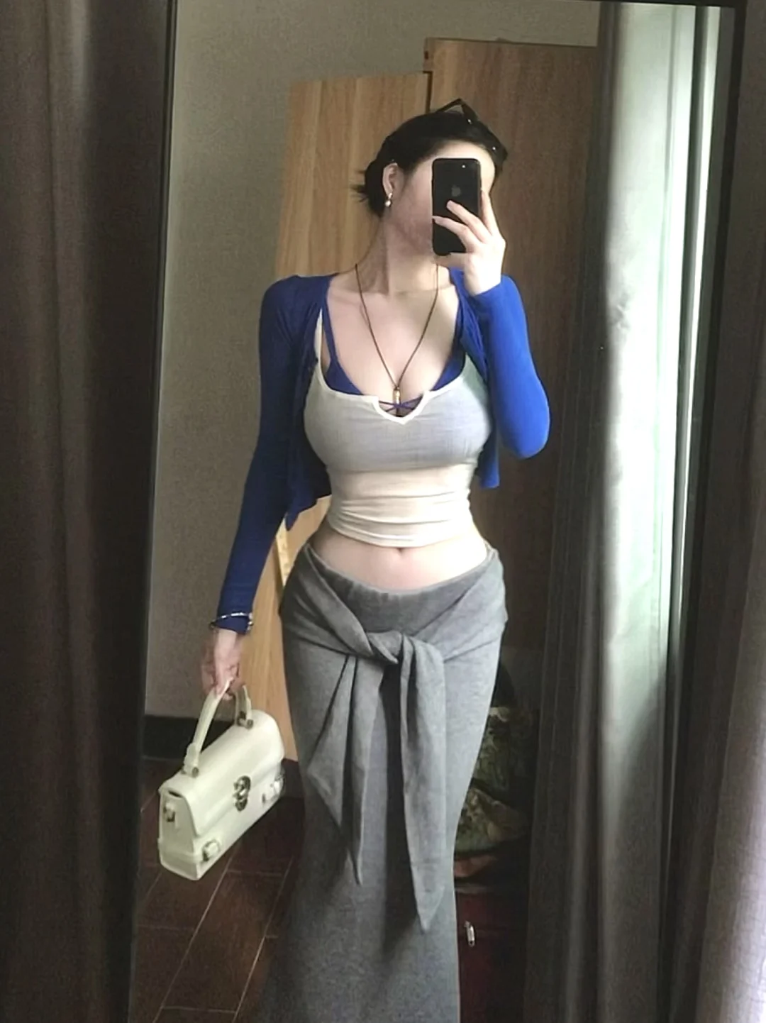 夏日清新穿搭,白色上衣+灰色针织衫,轻松自然,搭配牛仔裤,简约时尚。