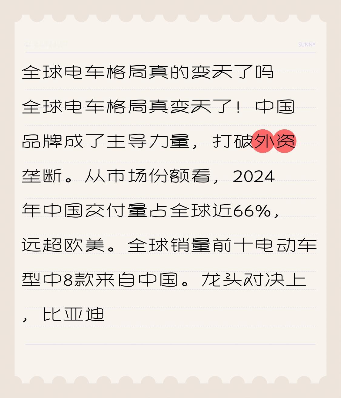 全球电车格局真的变天了吗 全球电车格局真变天了!中国品牌成了主导力量,打破外资垄断。从市场份额看,2024年中国交付量占全球近66%,远超欧美。全球销量前十电动车型中8款来自中国。 龙头对决上,比亚迪终结特斯拉垄断。2025年第三季度,比亚迪纯电销量超特斯拉,海外市场也全面反超。 不仅如此,中国品牌集体出海,吉利、上汽等也在抢占全球市场。核心技术上,中国车企亮点颇多,L4级自动驾驶技术成本仅为美国的十分之一。未来,中国电车全球市场份额有望突破50%,这格局转变太震撼!