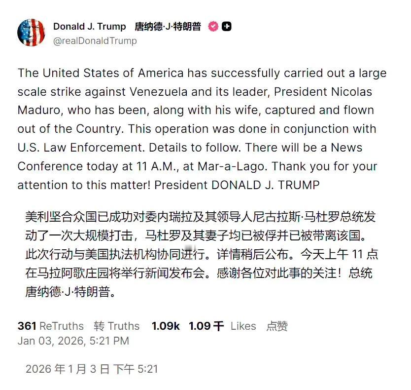 马杜罗被抓获!! 特朗普刚刚宣布: 委内瑞拉总统马杜罗以及马杜罗的妻子,已