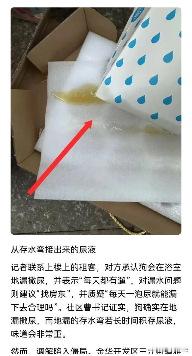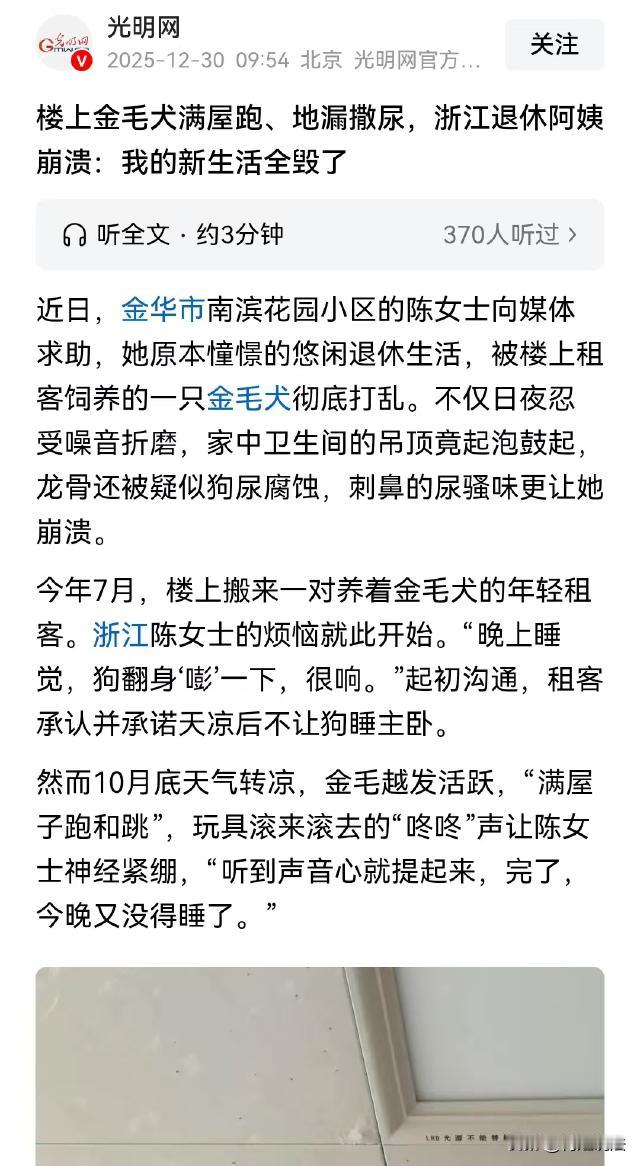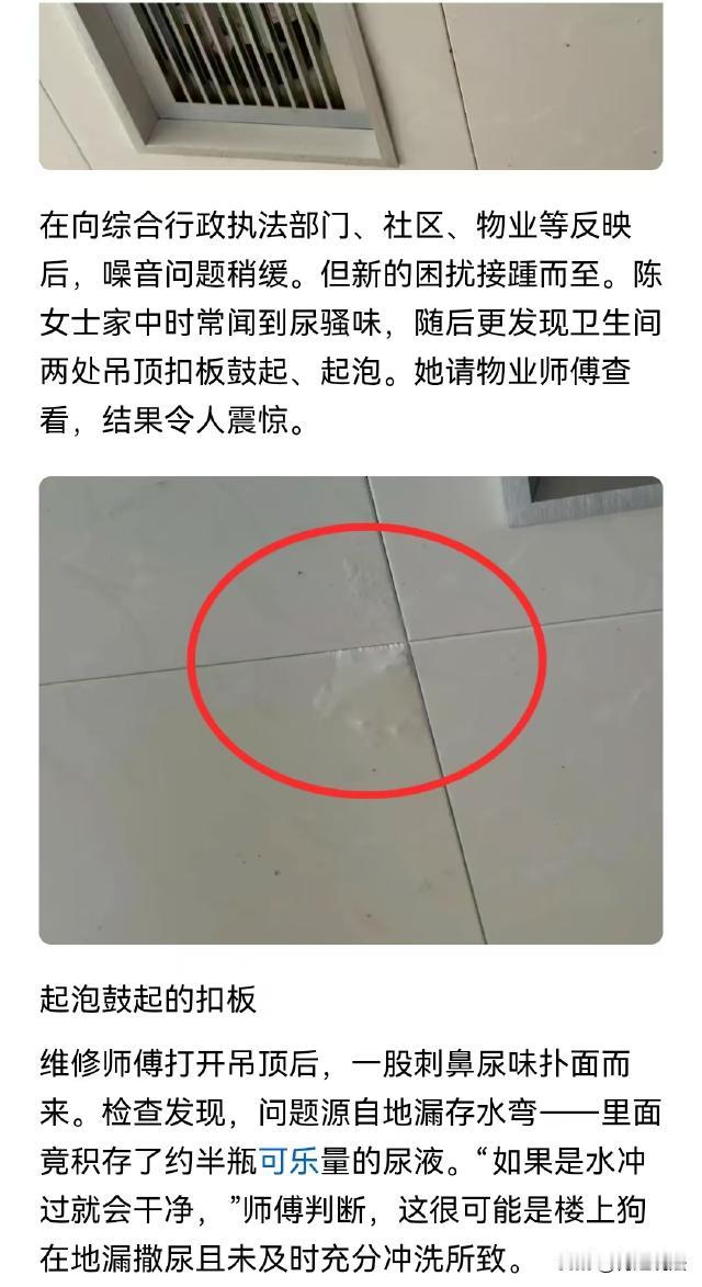 浙江金华,陈女士楼上搬来了一对租客,对方养了一只大金毛,狗子天天在房间里又跑又跳,吵得陈女士睡不着觉。并且,它还在地漏处尿尿,将陈女士房顶的吊顶都泡鼓起来了,满屋子都是尿骚味。可租户称这是漏水问题,应该找房东,房东却说,谁住谁负责。两人互相踢皮球,遭殃的却是陈女士。 据光明网报道,陈女士刚刚退休,在她的计划里,退休后该享受美好的晚年生活了,可陈女士的计划,却在半年前被楼上的租客全毁了。 今年7月,陈女士楼上搬来了一对年轻情侣,两人养了一只又大又漂亮的金毛。 可自从他们搬进来,陈女士的噩梦就开始了。 陈女士年纪大了,睡觉本来就比较轻。楼上的金毛和租客一起睡在卧室,半夜里金毛经常翻身,因太过肥硕,每次都会发出嘭的一声巨响。 陈女士经常被金毛翻身吓醒,没多久,因为睡不好觉,陈女士就长出了黑眼圈。 忍了几天后,陈女士实在受不了,就找楼上沟通了一下。他们说天太热,金毛怕热,才让它睡在卧室里的,等天冷了,就让它睡外面去。 陈女士也挺喜欢小动物的,听他们这么说,也就没再多追究。 可让陈女士没想到的是,10月份天气逐渐凉快了,金毛也确实不在卧室睡了,但它越来越活泼,经常满屋子又蹦又跳,还经常在房子里玩玩具。 玩具在房间里到处乱滚,金毛就跟在后面蹦蹦跳跳,陈女士家整天被咚咚声充斥。 陈女士天天睡不好觉,几个月下来都快神经衰弱了。 并且,因为和楼上租客多次沟通,双方已经产生了很多不愉快,噪音问题却一直没有解决。 陈女士被逼得没办法了,先后找小区、社区甚至行政部门多次投诉,终于,噪音问题好多了,陈女士几个月来第一次睡了个好觉。 可很快新的问题来了,不知道从啥时候开始的,陈女士家里经常能闻到尿骚味。 陈女士到处寻找,一直都没有找到气味来源,却意外发现她卫生间的吊顶扣板,有两处鼓了起来。 陈女士找维修师傅过来检查,师傅刚把扣板拆下来,一股令人作呕的尿骚味扑面而来。 陈女士被熏得直干呕,这才知道家里的骚味是从这里散发出来的。 师傅检查了一番,发现上面的地漏存水弯里面,竟然存了约莫半可乐瓶的尿! 师傅说,尿在地漏里,只要用水冲,尿就会冲下去,这里面应该是楼上狗尿的,主人没有及时清理,导致尿渗出来,将陈女士家的扣板泡坏了。 陈女士没有过多的诉求,只是希望楼上将被狗尿泡坏的龙骨和扣板更换一下。 楼上租客承认他们的狗会在地漏处尿尿,但又辩解说,他们每天都会遛狗,漏水是房东没做好防水,陈女士应该找房东。 可房东却说,他的房子租给租客的时候好好的,谁住谁负责,陈女士应该找租客。 《民法典》规定,行为人因过错侵害他人民事权益造成损害的,应当承担侵权责任。 陈女士的房顶龙骨和扣板被泡坏,到底应该由谁赔偿,关键在于确定谁在此事中存在过错。 《民法典》第一千二百四十五条规定,饲养的动物造成他人损害的,动物饲养人或者管理人应当承担侵权责任。 租客作为金毛犬的饲养人和管理人,却没有尽到妥善管理职责,导致狗在地漏处尿尿,泡坏了陈女士家吊顶,造成了陈女士的财产损失,因此,租客应当承担侵权责任。 同时,从合同相对性角度来看,租客与房东签订租赁合同,获得房屋使用权的同时,也需尽到合理使用房屋的义务。 《民法典》第七百一十四条规定,承租人应当妥善保管租赁物,因保管不善造成租赁物毁损、灭失的,应当承担赔偿责任。 虽然此次受损的是陈女士家的吊顶,但租客未妥善管理宠物,任由其在地漏处尿尿,未履行对房屋合理使用与保管的义务, 这种不当使用间接损害了相邻方陈女士的权益,租客理应对此负责。 另外,根据《民法典》第七百一十二条也有规定,出租人应当履行租赁物的维修义务,但是当事人另有约定的除外。 如果是因为房屋本身存在质量问题,导致地漏渗水,房东需要承担维修责任。 房东称将房屋出租时状况良好,是租客饲养的狗尿尿这一行为导致渗漏,并非房屋自身质量缺陷。 所以,要确认到底是谁的责任,还需要对渗水点进行检定。 如果渗水是一早就有的,房东就需要承担责任。 如果渗水是租客入住后不当使用导致的,房东在此事中就不存在直接过错,不应承担对陈女士的赔偿责任。 不过,《民法典》第二百八十八条规定,不动产的相邻权利人应当按照有利生产、方便生活、团结互助、公平合理的原则,正确处理相邻关系。 俗话说远亲不如近邻,陈女士楼上的租客也好,房东也好,大家抬头不见低头见,有义务避免自身行为对相邻方造成损害。 租客养的狗在屋内又跑又跳制造噪音,还在地漏处尿尿泡坏楼下吊顶,违反了相邻关系中应尽的义务。 房东虽然不直接和陈女士产生纠纷,但作为房主,应在租客和陈女士之间积极协调沟通,引导租客承担责任。 对于本案,您怎么看?