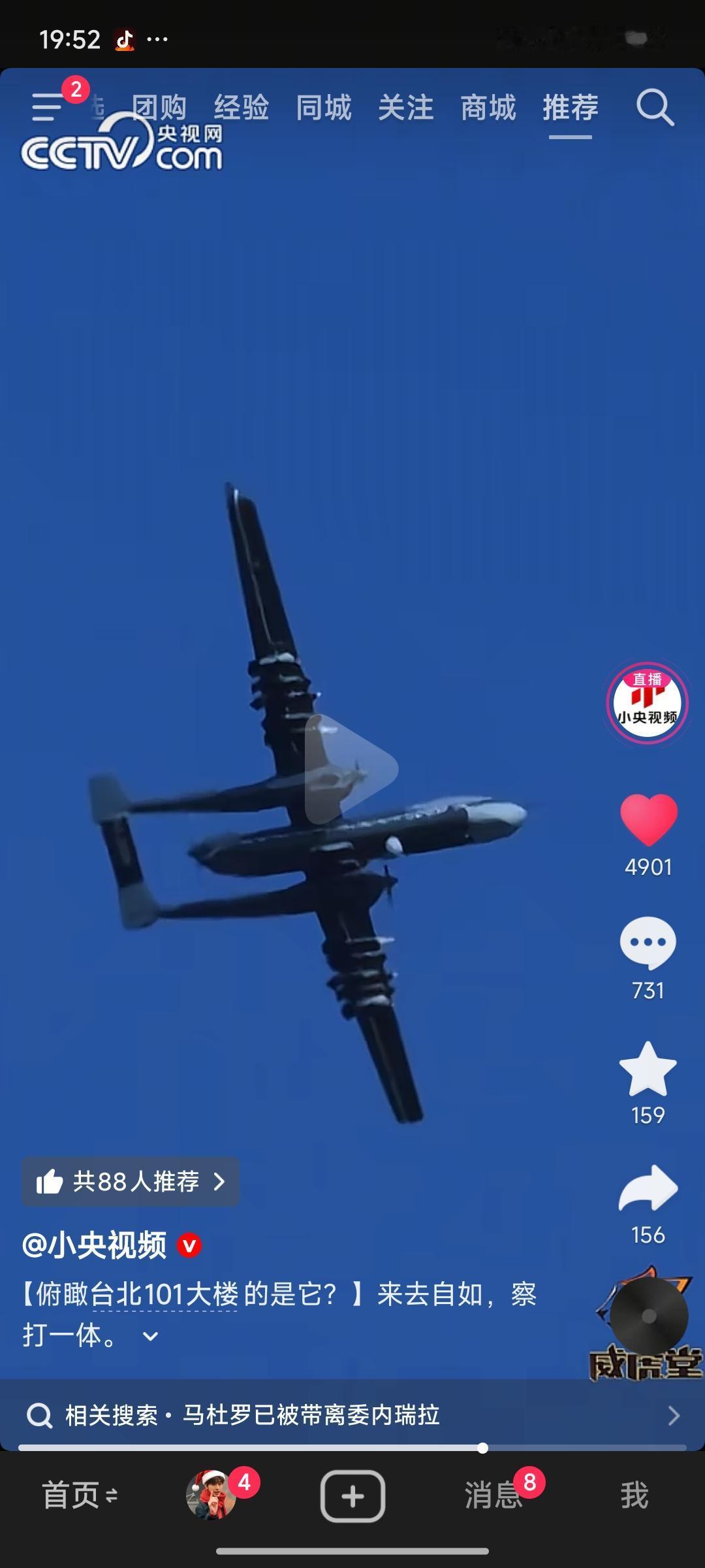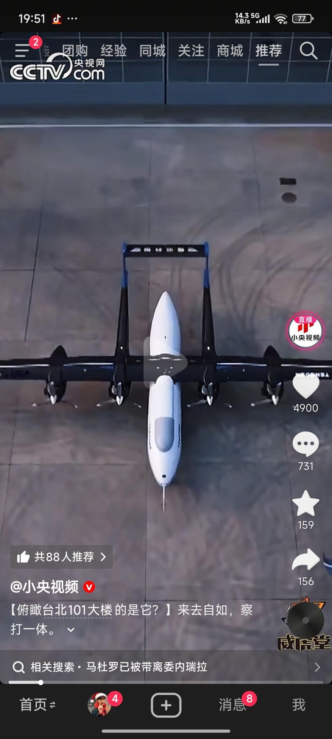 央视公布了俯拍台北101大厦的无人机画面,镜头里这架无人机在澄澈的蓝天下穿梭的身
