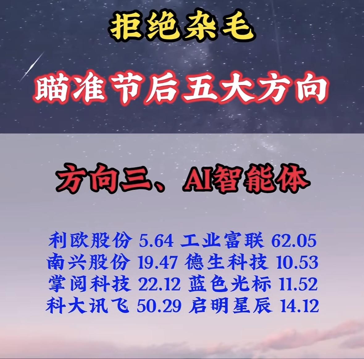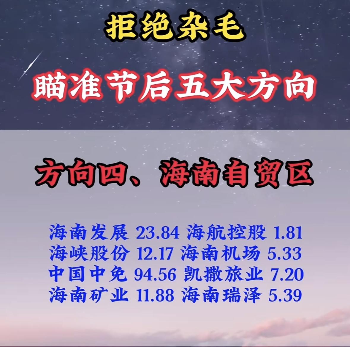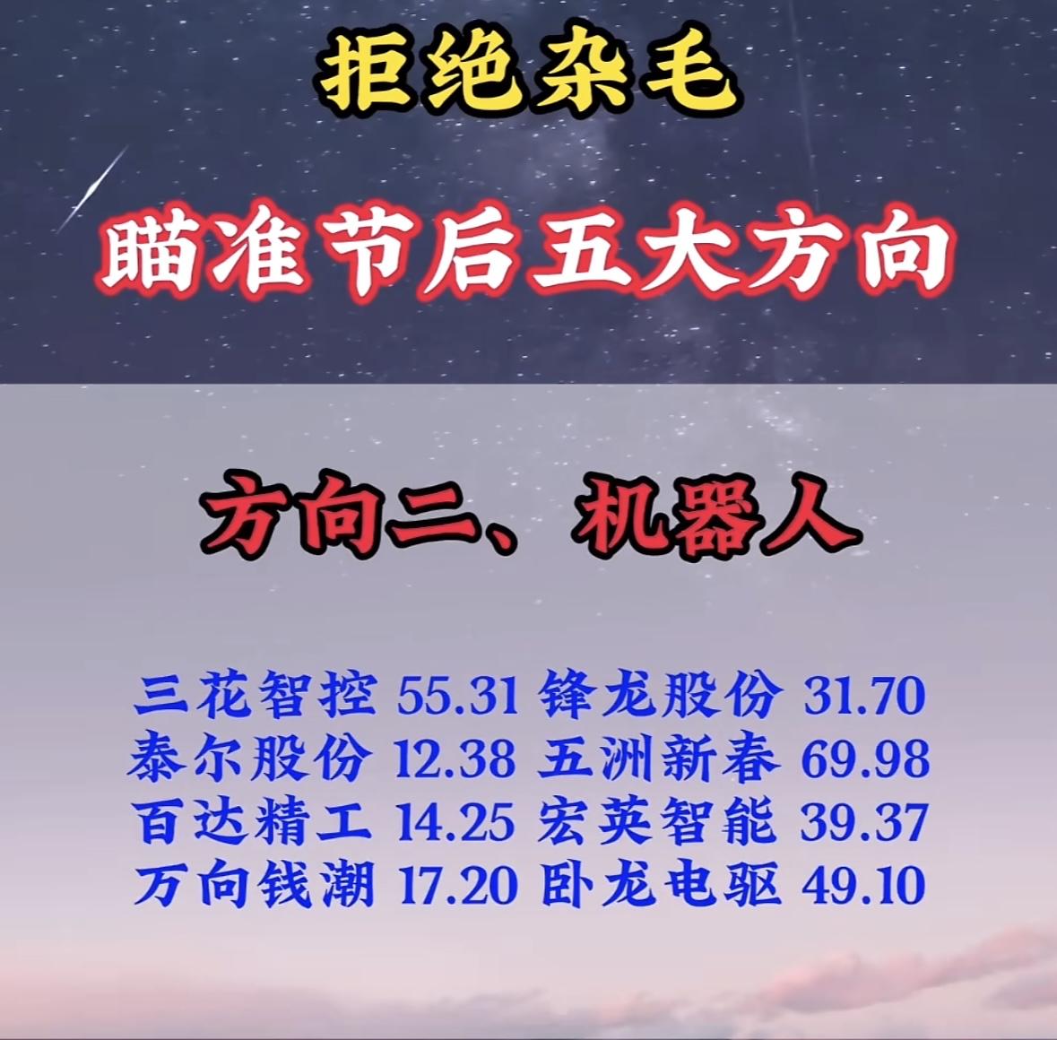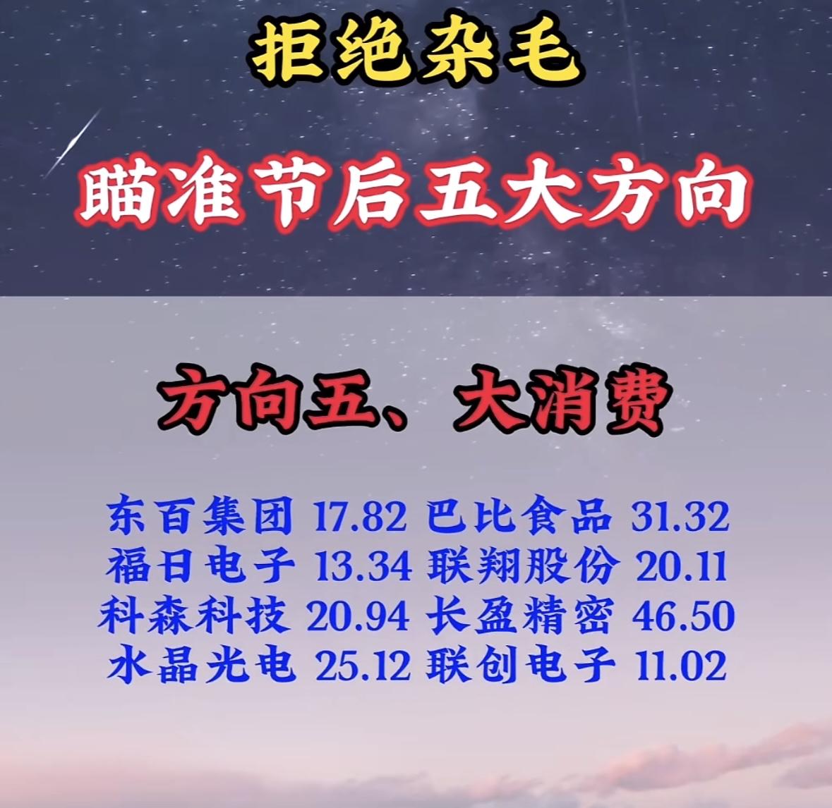 节后大消费,最有潜力的五大方向,看看谁能引领潮流,是商业航天还是机器人、我们拭目以待。 "聚焦商业航天等五大方向, 精选龙头股布局节后行情, 趋势明朗机会多。"