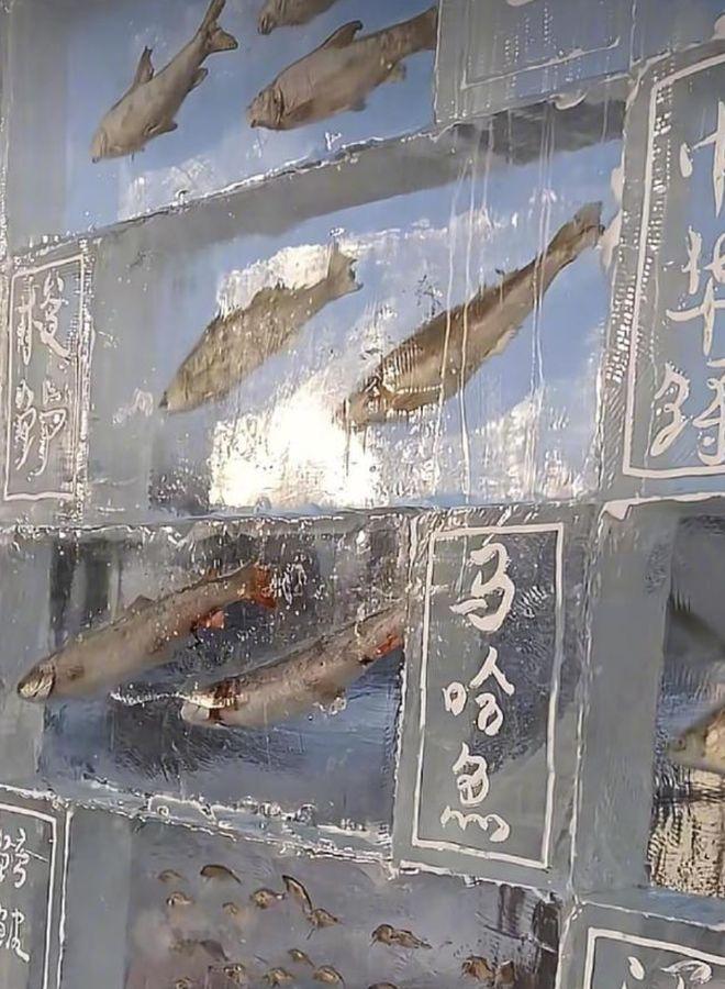 黑龙江同江三江口这处冰封鱼墙,真的把东北的浪漫刻进骨子里了!3米高8米宽的冰墙里,冰封着黑龙江、松花江的20多种江鱼,马哈鱼、鲟鱼、还有龙江人熟知的三花五罗十八子都在其中,鱼儿摆着游弋的姿态凝在冰里,像极了天然的冰琥珀。 这可不是普通冰雕,是把东北的冷水渔产和冰雪文化揉在了一起,赫哲族的渔猎风情全藏在这面冰墙里。东北的冬天太会整活了,别人逛水族馆,咱东北人逛冰鱼墙,零下几十度的极致浪漫,果然还得看龙江!