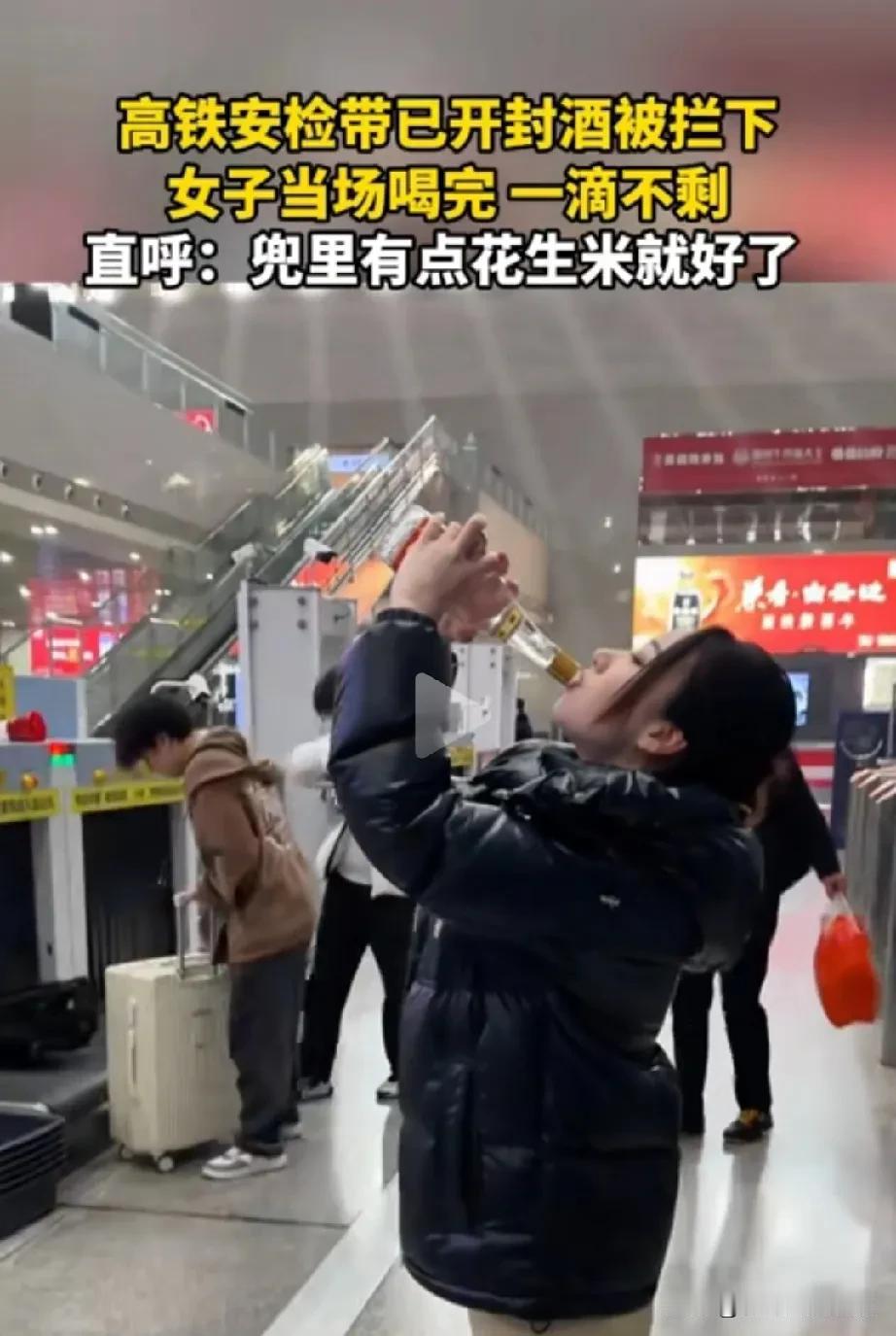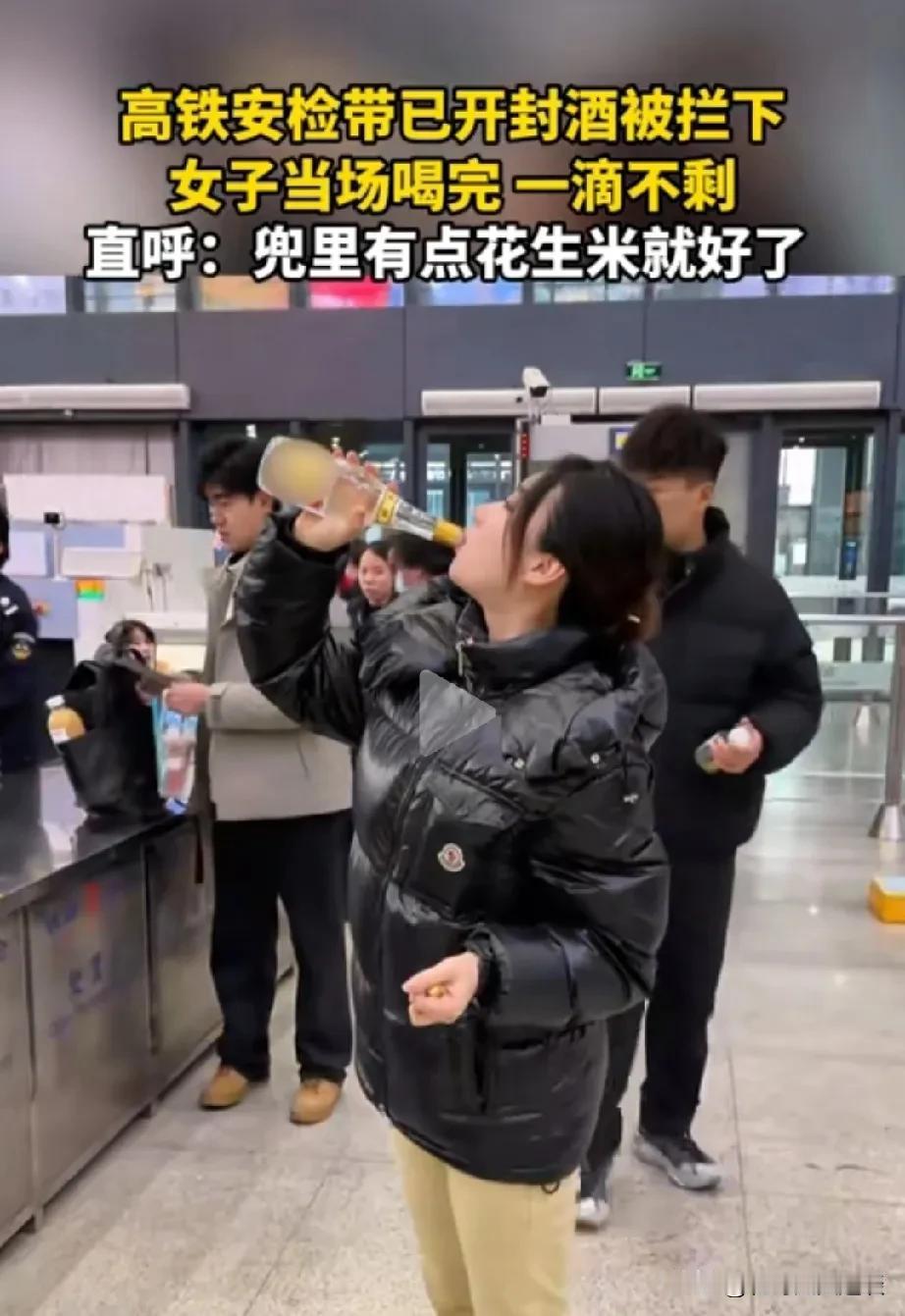 女子真是一个狠人。她坐高铁带了一瓶白酒被安检出来,需要扣下。女子一看,这瓶白酒不能带,二话不说直接打开对瓶吹,一会给喝完了,还说有花生米就好了。高铁上白酒不能带吗?这女子太厉害了,一瓶白酒直接喝完了,一般人不得喝醉了,她竟然没事,继续乘车。 网友说,啥酒啊值得那么拼命吗?看着像五粮液,一瓶好几百呢,扔了怪可惜的。