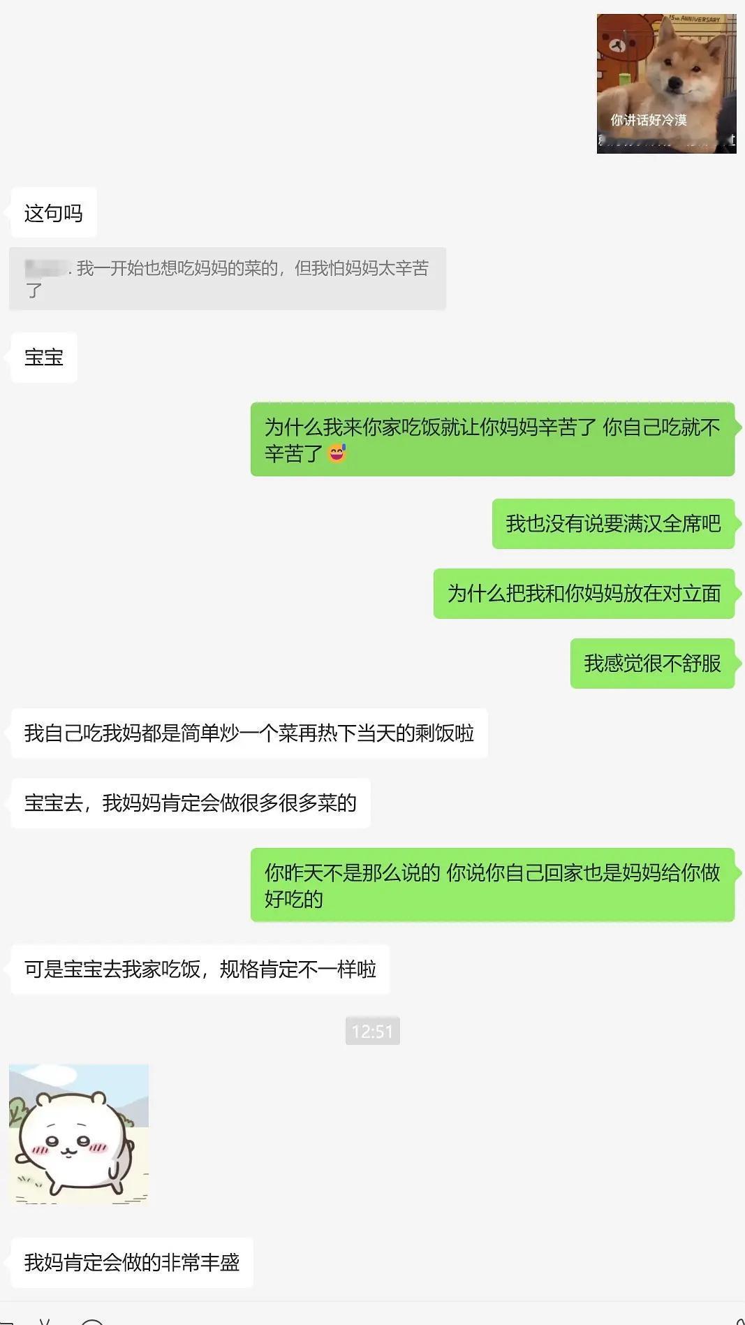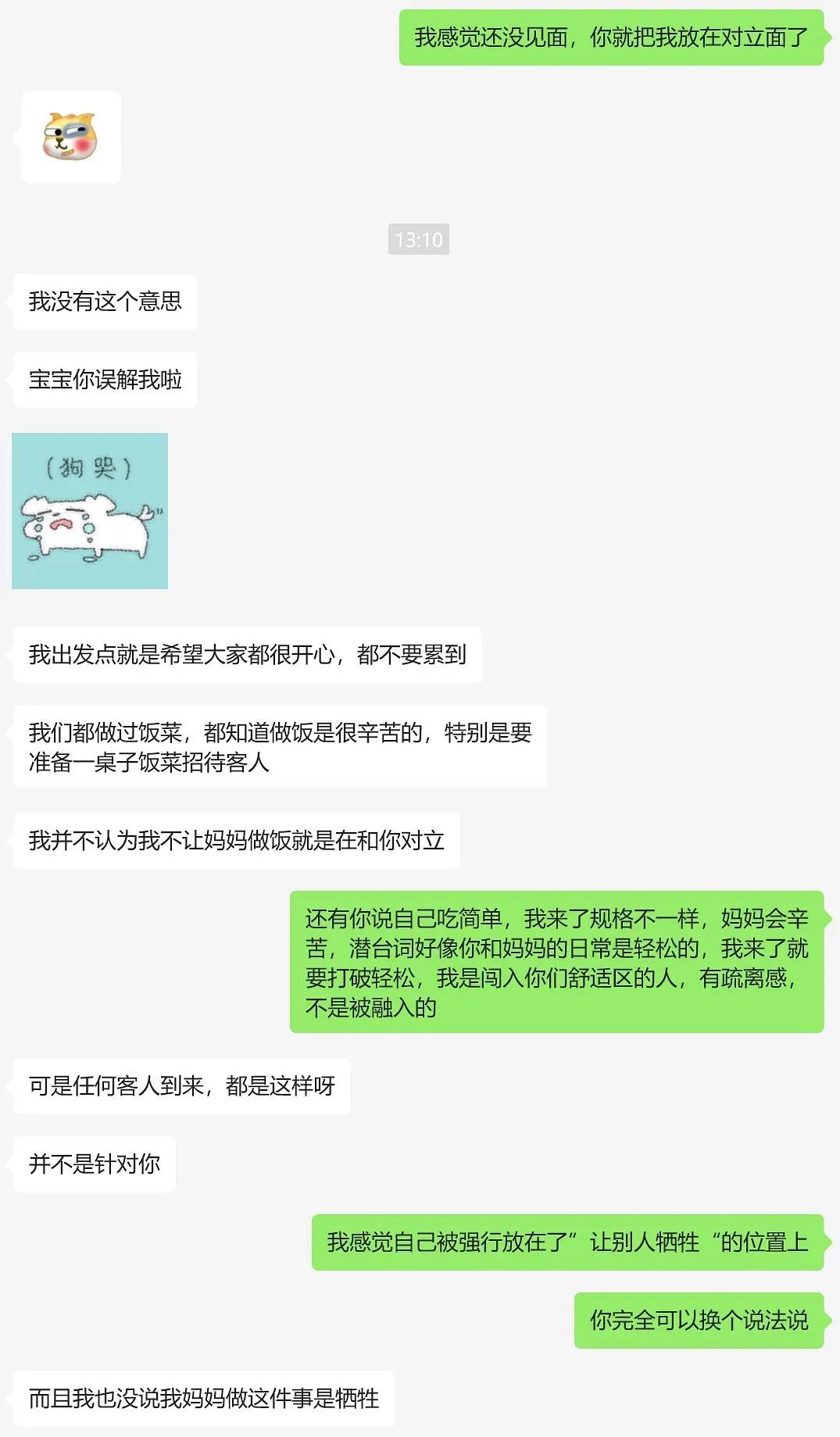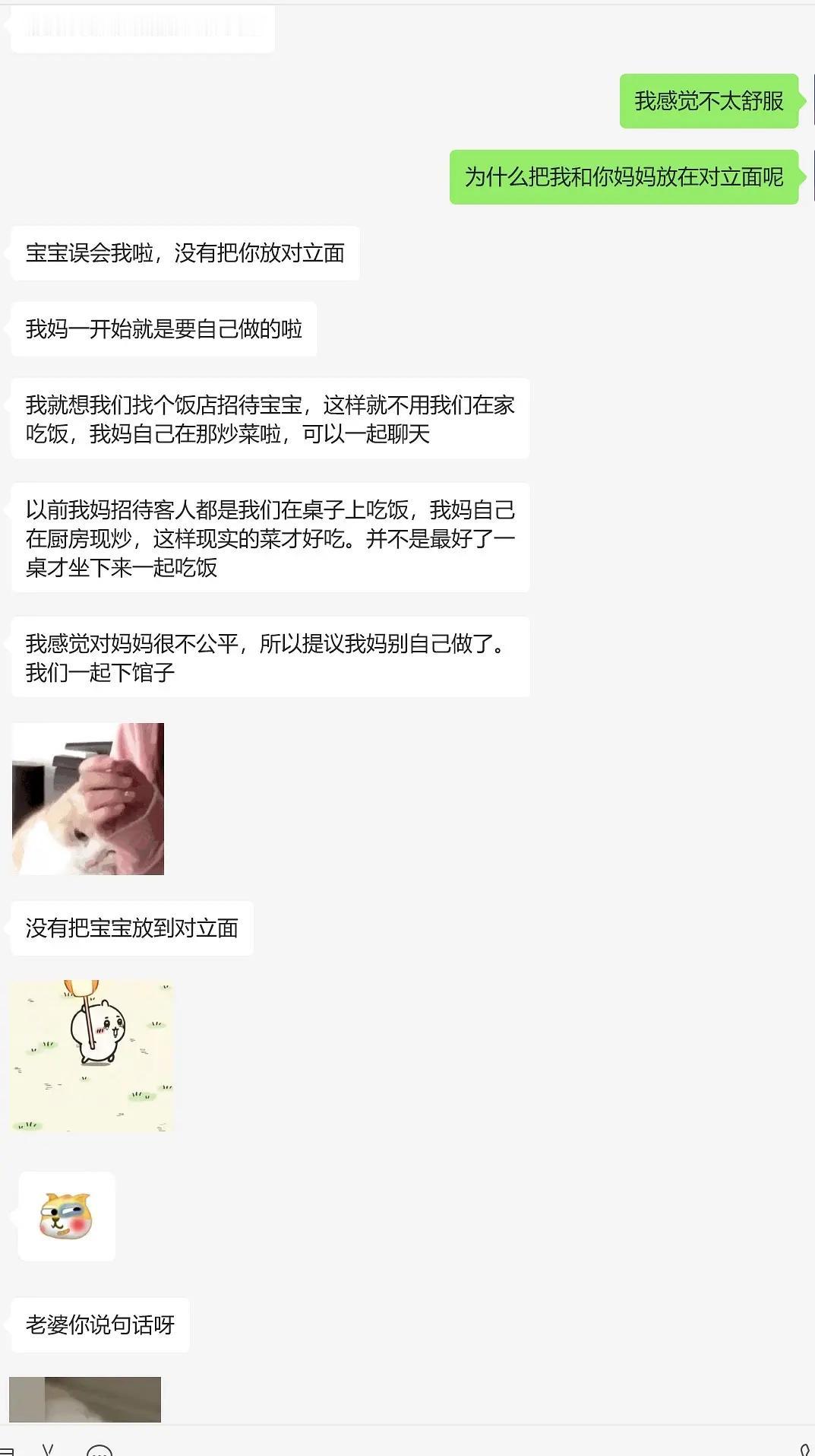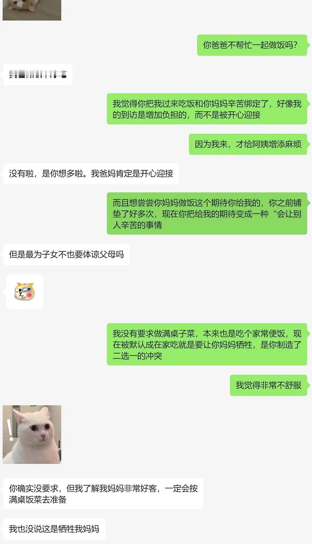 近日,一女网友准备去男朋友家见父母,本是一件高兴的事,但就因为男朋友说,不想妈妈那么辛苦,就不准备在家里做饭吃了,去外面餐馆吃,结果女网友觉得男朋友把她和他妈妈放在了对立面,觉得到男朋友家拜访是给他们增加负担,而不是开心的迎接…. 看了他们的聊天记录,感觉女方是不是有点敏感了…其实下馆子也没什么,吃完拍拍屁股走人,大家都能轻松点!不过男方也是,妈妈做饭做了二十几年没有觉得辛苦,女朋友要来了就意识到妈妈辛苦了… 现在女网友想听听大家伙的建议,是否对男朋友太过苛责了… 不过大家当初第一次去对象家里拜访时,是在家里吃还是在餐馆吃呢?