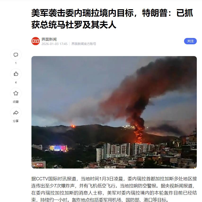 特朗普疯起来是真的没底线!美国特种部队突袭委内瑞拉,直接绑走马杜罗夫妇,一时间搅乱拉整个美格局。 央视最新报道确认,美国特种部队深夜突袭委内瑞拉首都加拉加斯,趁着夜色突破总统府安保防线,当场抓获总统马杜罗及其夫人西莉亚·弗洛雷斯,随后用军用运输机连夜送往境外,全程连2小时都没到。 要知道,就算是当年美国针对萨达姆、卡扎菲,好歹还找了个“大规模杀伤性武器”的借口,特朗普倒好,连伪装都懒得做,直接派特种部队跨境抓他国元首,活脱脱一副“我看上你了就得办你”的强盗做派。 更讽刺的是,就在突袭前一天,美国国务院还在公开呼吁“与委内瑞拉进行建设性对话”,转头就动了手,这翻脸速度比翻书还快。 可能有人会问,特朗普为啥非要跟马杜罗死磕?这事儿得从十年前说起,早在2015年特朗普第一次竞选总统时,就把委内瑞拉当成了“眼中钉”。 当时委内瑞拉是拉美反美阵营的核心,马杜罗政府不仅拒绝美国资本渗透,还联合古巴、玻利维亚等国搞“去美元化”,把美国在当地的石油利益搅得鸡犬不宁。 要知道,委内瑞拉的石油储量全球第一,美国早就想把这块肥肉攥在手里,可马杜罗偏不配合,硬生生把美国石油巨头赶出了国门。 特朗普第一次上台后,就对委内瑞拉下了死手,先是联合盟友搞经济封锁,冻结委内瑞拉海外资产,接着又扶持反对派瓜伊多,宣称他才是“合法总统”,甚至差点发动军事政变。 但马杜罗也不是软柿子,靠着军队和民众支持硬生生扛了下来,还反过来揭露美国的干涉阴谋,让特朗普丢了大脸。 2021年特朗普卸任时,还特意在备忘录里写着“必须解决马杜罗问题”,现在看来,他是把这事儿当成了“复仇清单”的首要任务。 马杜罗被抓后,委内瑞拉国内直接陷入混乱,支持马杜罗的民众走上街头抗议,军方则紧急进入战备状态,宣布关闭所有边境口岸。 拉美各国更是反应强烈,墨西哥总统公开谴责美国“无视国家主权”,古巴直接召回驻美大使,巴西、阿根廷等国也发表声明,要求美国立即释放马杜罗。 就连美国的盟友欧盟,都罕见地表达了“担忧”,认为美国的做法会加剧拉美地区的动荡。 特朗普之所以敢这么肆无忌惮,说白了就是吃准了拉美国家的实力薄弱,又摸准了国际社会的反应节奏。 他清楚,就算各国谴责,也没人敢真的跟美国硬碰硬;就算联合国召开紧急会议,美国作为常任理事国也能一票否决相关决议。 这种“我是老大我说了算”的霸权逻辑,在他身上体现得淋漓尽致。 更关键的是,特朗普盯着的从来不是马杜罗本人,而是委内瑞拉的石油资源。近年来,美国一直在推动“能源独立”,但对委内瑞拉的石油依赖始终没断。 马杜罗政府上台后,一直坚持石油国有化,拒绝美国资本介入,这直接戳中了美国的痛处。 现在把马杜罗抓了,美国就能扶持亲美政权,重新掌控委内瑞拉的石油产业,到时候不仅能解决自身的能源需求,还能卡死欧洲和亚洲的能源供应,可谓一举两得。 有人可能会说,美国这么做就不怕遭到报复吗?还真不怕。 委内瑞拉的军事力量在拉美只能算中等水平,空军连像样的战斗机都没有,海军更是只有几艘老旧的护卫舰,根本不是美国的对手。 而且,美国在拉美部署了大量军事基地,从佛罗里达到巴拿马运河,到处都是美国的驻军,一旦委内瑞拉军方敢反抗,美国随时能发动更大规模的军事打击。 回顾历史,美国对拉美从来就没客气过。从19世纪的“门罗主义”开始,美国就把拉美当成了“自家后院”,凡是不听话的国家,要么被经济封锁,要么被扶持代理人推翻,要么直接发动军事干预。 古巴革命后,美国对古巴封锁了六十多年;智利前总统阿连德因为推行国有化,被美国中情局策划的政变推翻,最终被迫自杀;巴拿马总统诺列加因为不听话,直接被美国特种部队抓走,关进了美国监狱。 这次抓捕马杜罗,不过是美国干涉拉美事务的又一个缩影。但不同的是,现在的国际形势已经变了,不再是美国一家独大的时代。 中国、俄罗斯等新兴国家正在崛起,越来越多的国家开始反抗美国的霸权。 特朗普的这次冒险操作,看似赢了一时,实则埋下了巨大的隐患。一旦拉美各国联合起来反美,美国在当地的利益将遭受重创;一旦俄罗斯和中国介入,局势很可能会失控。 更重要的是,美国的做法彻底暴露了其霸权本质,让更多国家看清了美国的真面目,越来越多的国家会加入“去美元化”和反美阵营,美国的全球霸权地位将进一步动摇。 现在最让人关心的是,马杜罗会被带到哪里?美国会如何处置他? 从以往的案例来看,美国很可能会以“破坏民主”“侵犯人权”等罪名起诉马杜罗,把他关进监狱,然后扶持亲美政权上台。 但委内瑞拉民众肯定不会答应,到时候很可能会爆发内战,拉美地区将陷入长期动荡。 最后想问一句,特朗普这次真的能如愿以偿吗?欢迎在评论区留下你的看法,咱们一起聊聊这起震惊全球的突袭事件。