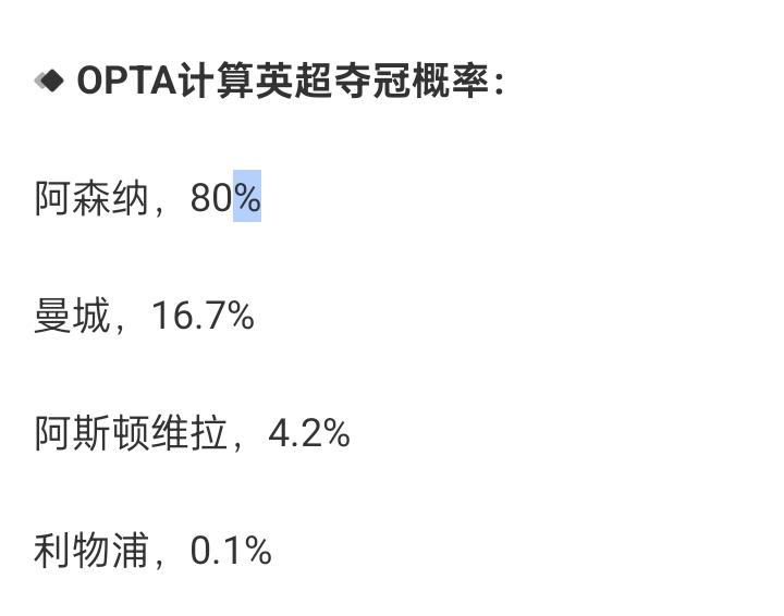 英超最新夺冠概率:阿森纳80%遥遥领先,曼城16.7%第二,利物浦0.1%第三 01月03日 英超赛季已过半,OPTA计算最新的英超夺冠概率:阿森纳以80%的夺冠概率遥遥领先,曼城为16.7%第二,阿斯顿维拉4.2%第三,利物浦0.1%第四