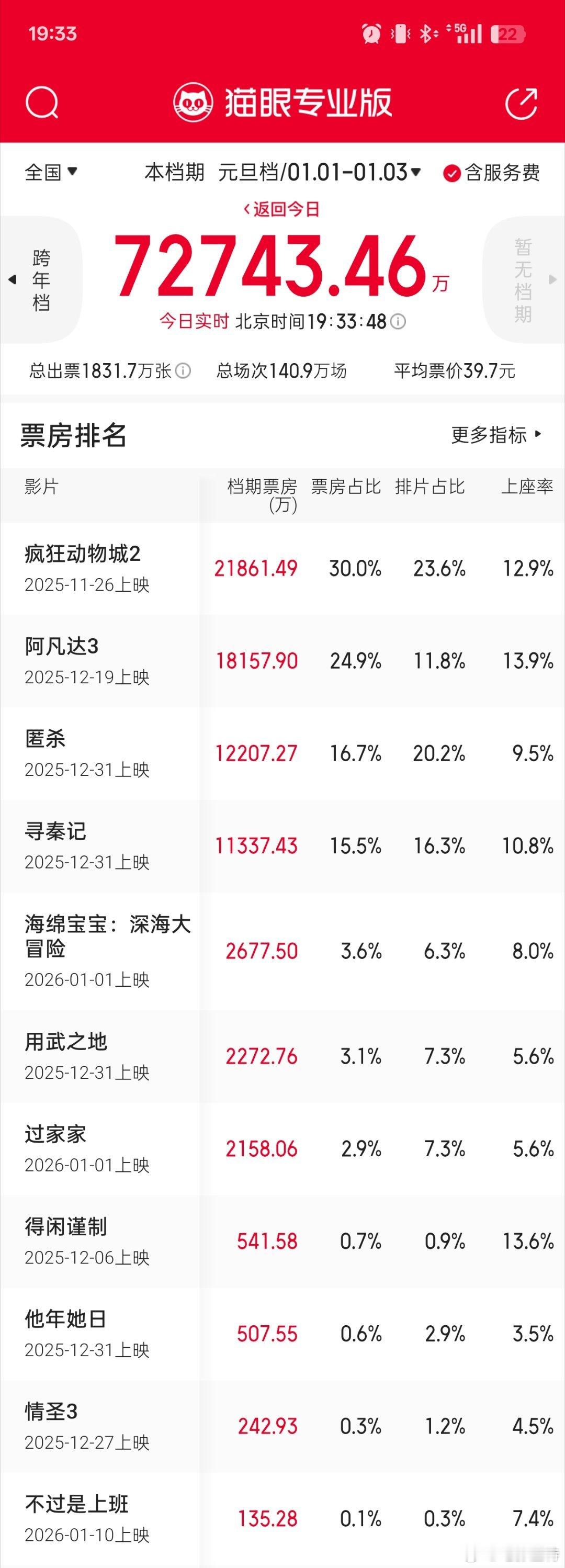 听听温特怎么说 元旦档7.3亿。前四名破亿,两部好莱坞老片冠军亚军其中《疯狂动物城2》上映一个多月来单日票房破亿。《匿杀》和《寻秦记》都是出品猫眼发行,前五名都是猫眼发行或者协助推广。