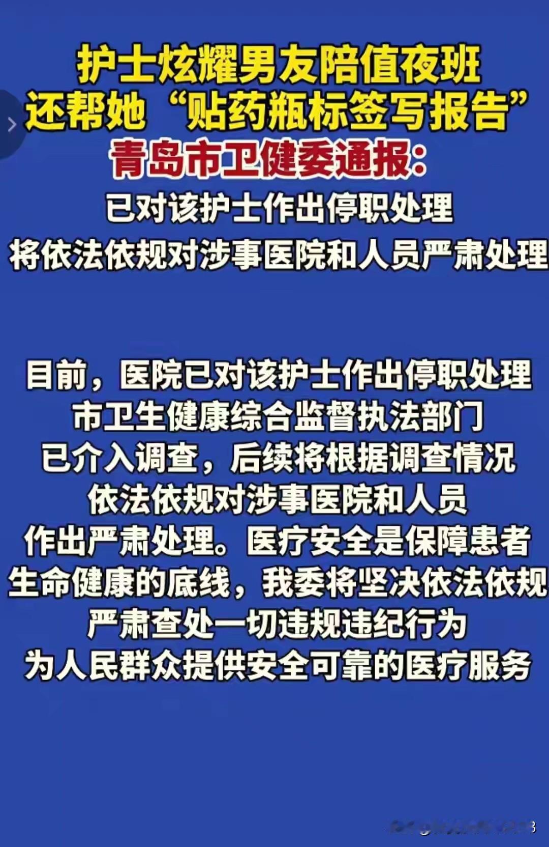 真是无知者无畏,秀恩爱“死”得快! 青岛一家医院的护士小姐姐,为排遣值夜班的无聊,竟叫男友陪她值班,还让男友帮忙干活。 写值班报告、给药品贴标签,男友忙得不亦乐乎。贴心的护士小姐姐,还不忘发上网炫耀男友能干。 结果,第二天一早,她等来的不是网友祝福,而是被辞退的通知。 估计院里的护士长和一些领导也会受处分,真是害人又害己!