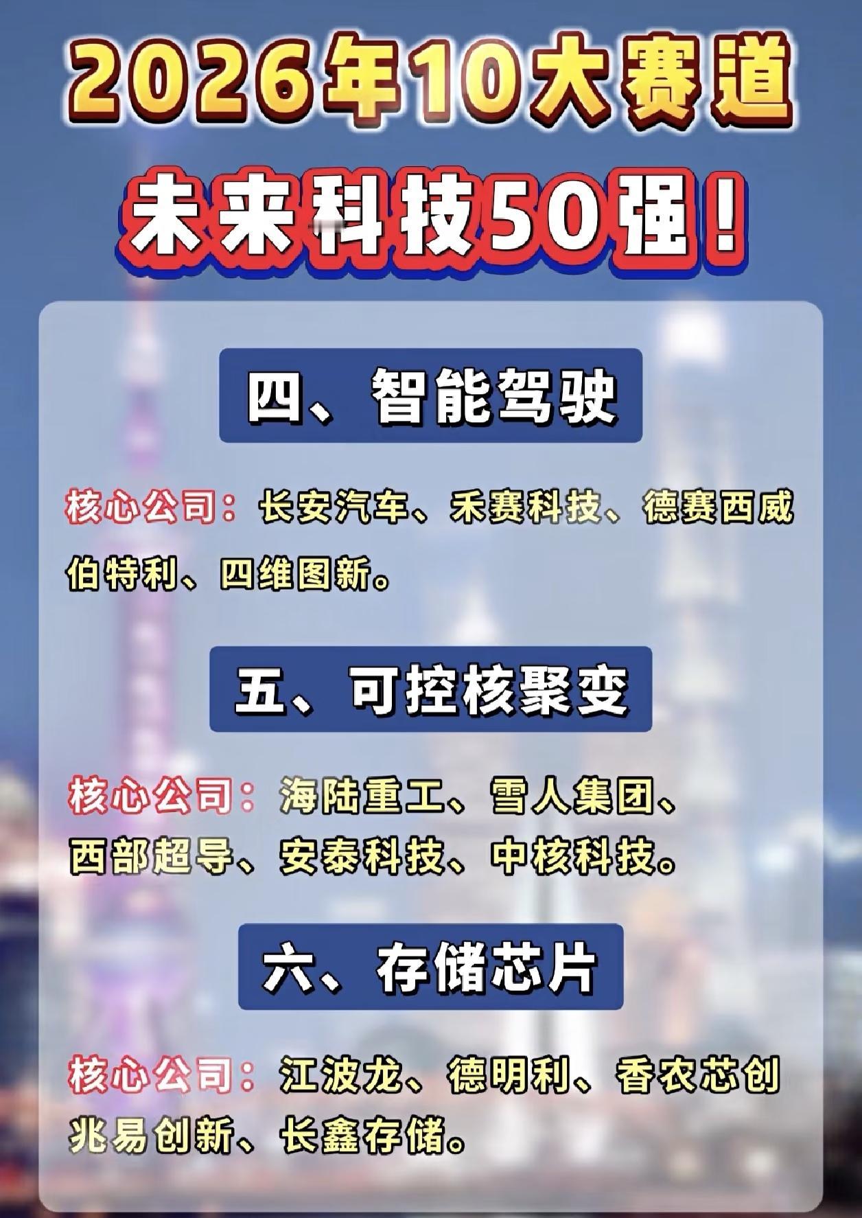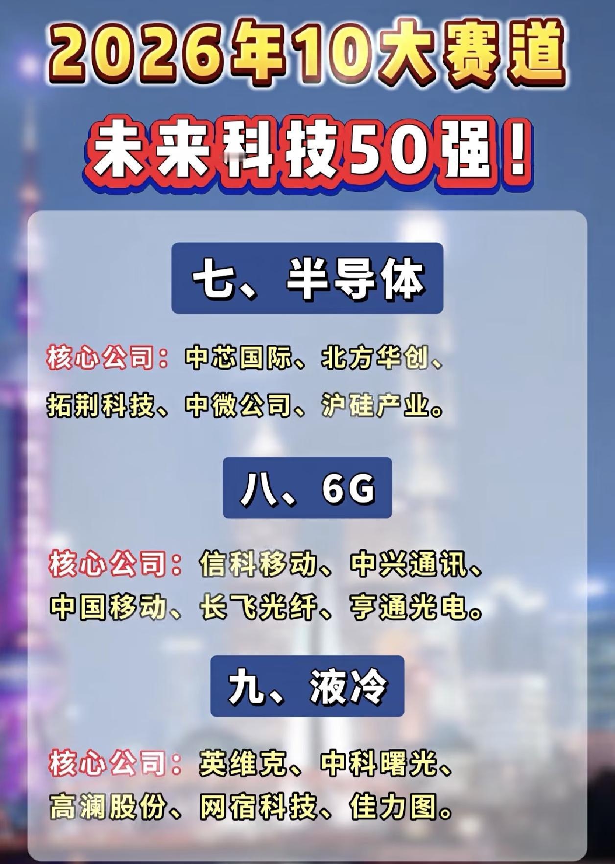 “2026年10大赛道 未来科技50强!”榜单涵盖了未来科技领域的十大重要方向及对应的核心公司,具体如下: 1. 人形机器人:核心公司包括绿的谐波、汇川技术、中科创达、拓普集团、三花智控。 2. AI算力:核心公司包括寒武纪、中际旭创、中科曙光、工业富联、沐曦股份。 3. 商业航天:核心公司包括中国卫星、中国卫通、铖昌科技、航天电子、上海沪工。 4. 智能驾驶:核心公司包括长安汽车、禾赛科技、德赛西威、伯特利、四维图新。 5. 可控核聚变:核心公司包括海陆重工、雪人集团、西部超导、安泰科技、中核科技。 6. 存储芯片:核心公司包括江波龙、德明利、香农芯创、兆易创新、长鑫存储。 7. 半导体:核心公司包括中芯国际、北方华创、拓荆科技、中微公司、沪硅产业。 8. 6G:核心公司包括信科移动、中兴通讯、中国移动、长飞光纤、亨通光电。 9. 液冷:核心公司包括英维克、中科曙光、高澜股份、网宿科技、佳力图。 10. 光刻机:核心公司包括中芯国际、张江高科、华特气体、福晶科技、容大感光。 整体来看,这十大赛道覆盖了人工智能、智能制造、航空航天、新能源、通信技术、半导体制造等多个前沿科技领域,榜单中的核心公司代表了中国在这些方向的主要力量。