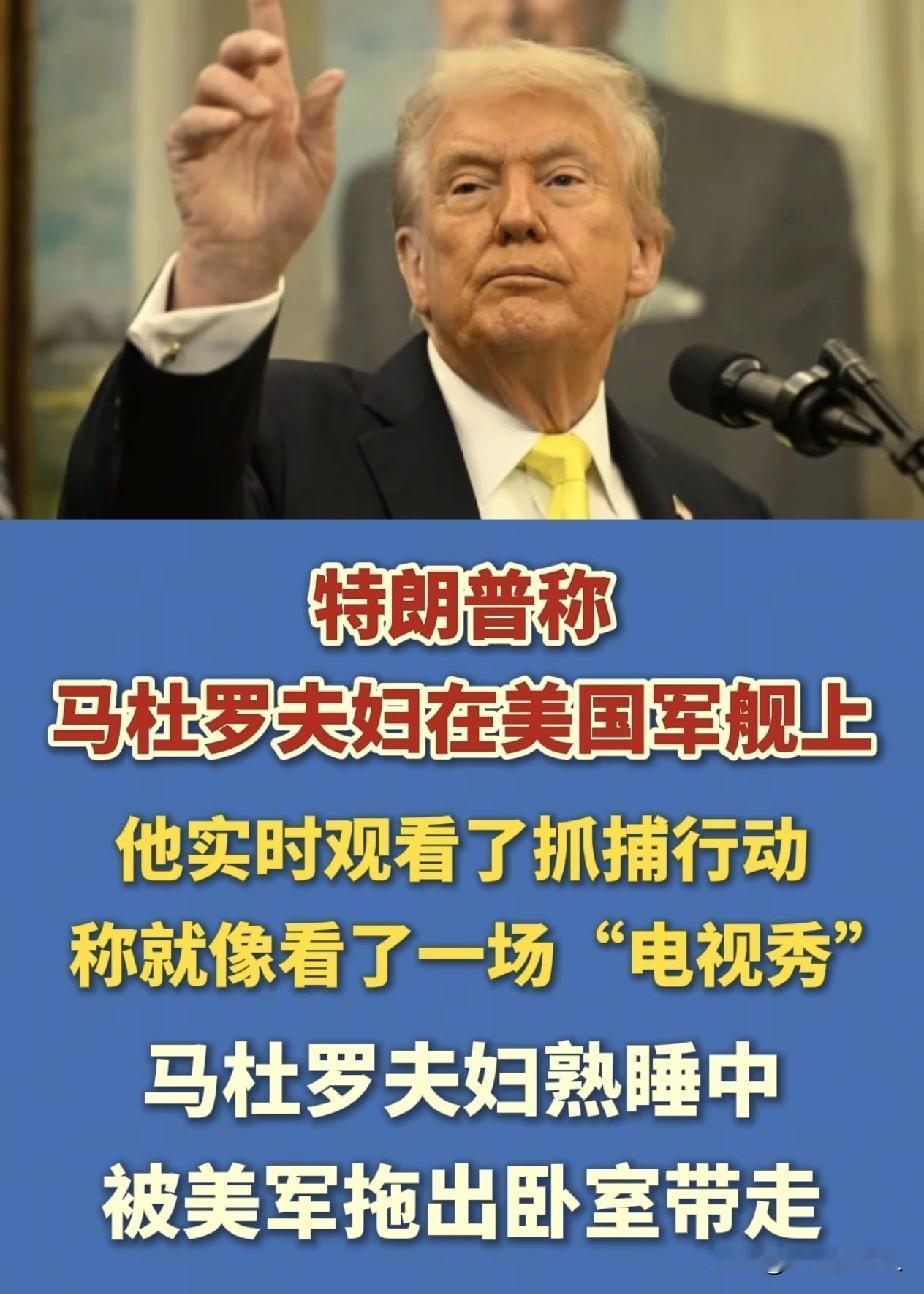 特朗普有点不“地道”了! 美军抓捕马杜罗和他夫人时,他们正在卧室熟睡,特朗普公开说他全程看了抓捕录像,像看电视节目一样。 特朗普透露,目前马杜罗在美国某艘军舰上,由三角洲特种部队将马杜罗从加拉加斯带走。 美军这次采用空袭加特种作战的方式,短短3个小时,就将委内瑞拉总统给抓了,这速度令人不可思议。 真是难以想象,委内瑞拉的防空还有情报部门,为何能反应如此之慢? 特朗普这手段真硬,但是你把人家都抓了,还公开说抓捕过程就像看电视节目一样,这就有点杀人诛心了!