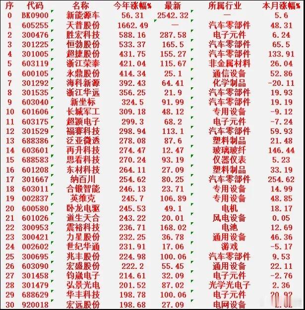 新能源车概念,2025年以来涨幅最多的30名单新能源车:今年涨幅 +56.31%天普股份:今年涨幅 +1662.49%,最新价 —(数据暂缺),本月涨幅 +48.31%胜宏科技:今年涨幅 +588.16%,最新价 287.58元,本月涨幅 +6.24%恒勃股份:今年涨幅 +533.37%,最新价 165.50元,本月涨幅 +65.50%超捷股份:今年涨幅 +431.75%,最新价 155.27元,本月涨幅 +133.91%浙江荣泰:今年涨幅 +421.04%,最新价 115.67元,本月涨幅 +26.04%永鼎股份:今年涨幅 +414.34%,最新价 25.10元,本月涨幅 +52.86%海科新源:今年涨幅 +392.43%,最新价 64.41元,本月涨幅 -20.11%浙江华远:今年涨幅 +356.25%,最新价 21.90元,本月涨幅 +19.93%新坐标:今年涨幅 +324.50%,最新价 91.99元,本月涨幅 +19.19%长城军工:今年涨幅 +309.18%,最新价 48.12元,本月涨幅 -9.12%