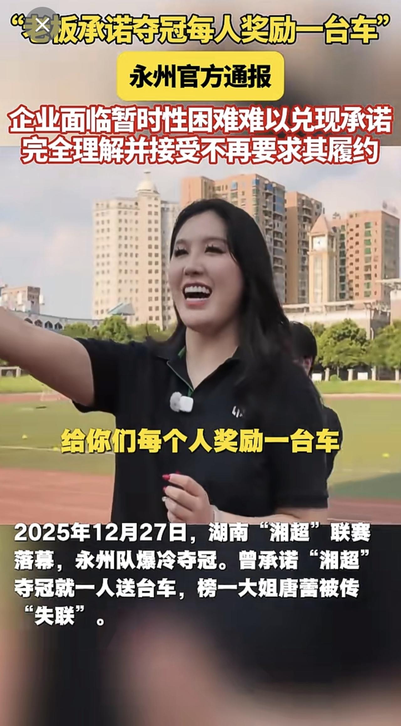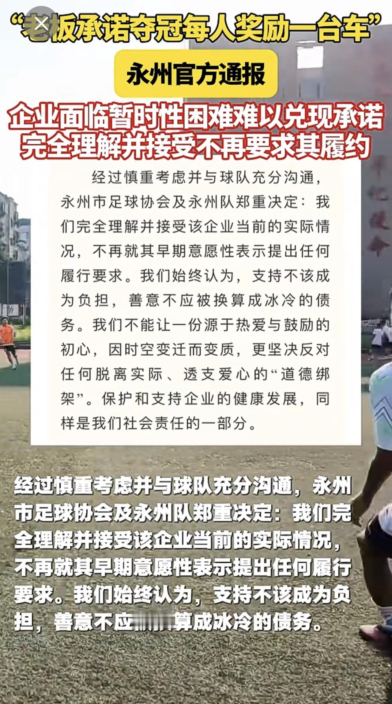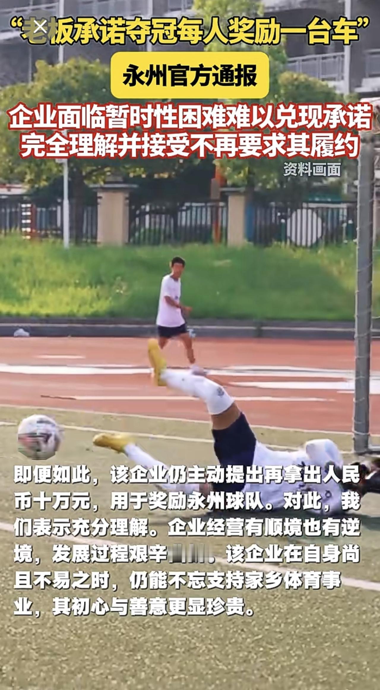 “老板承诺夺冠每人奖励一台车”,永州官方通报:企业面临暂时性困难难以兑现承诺 完全理解并接受不再要求其履约。