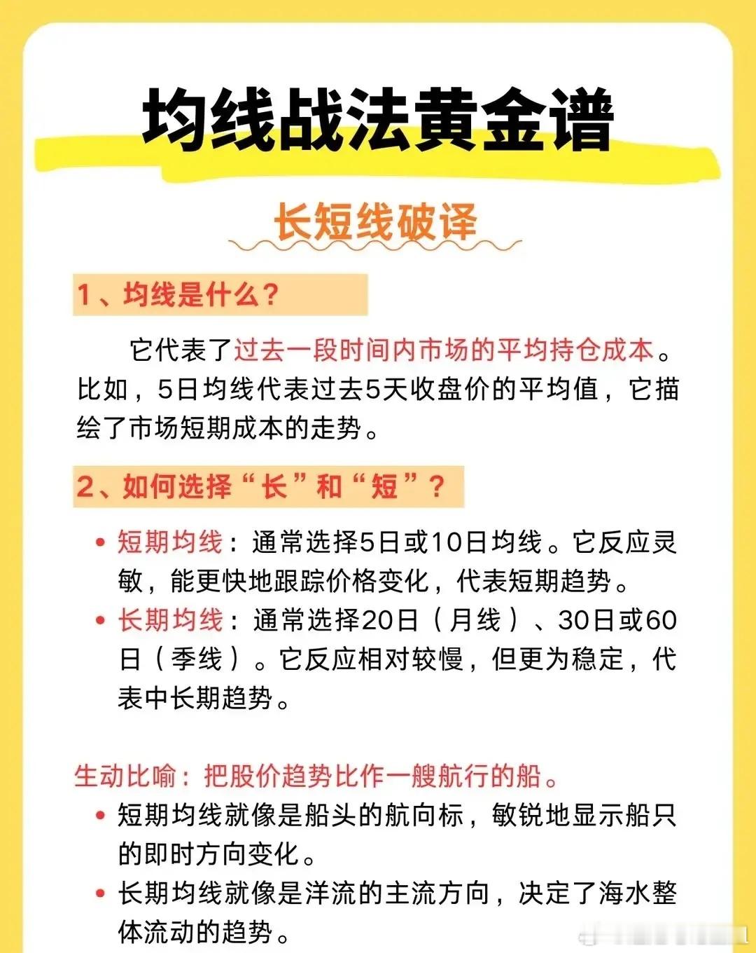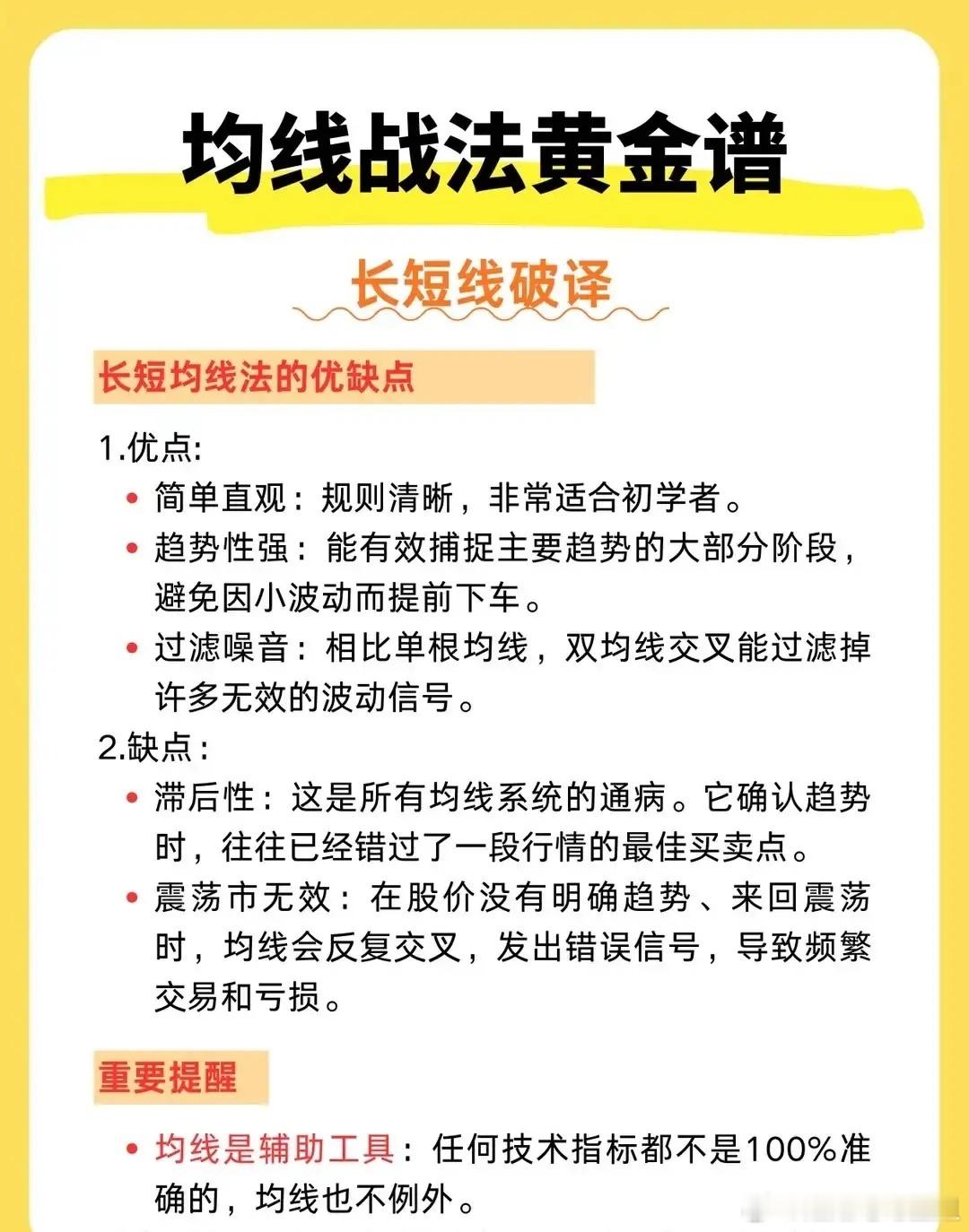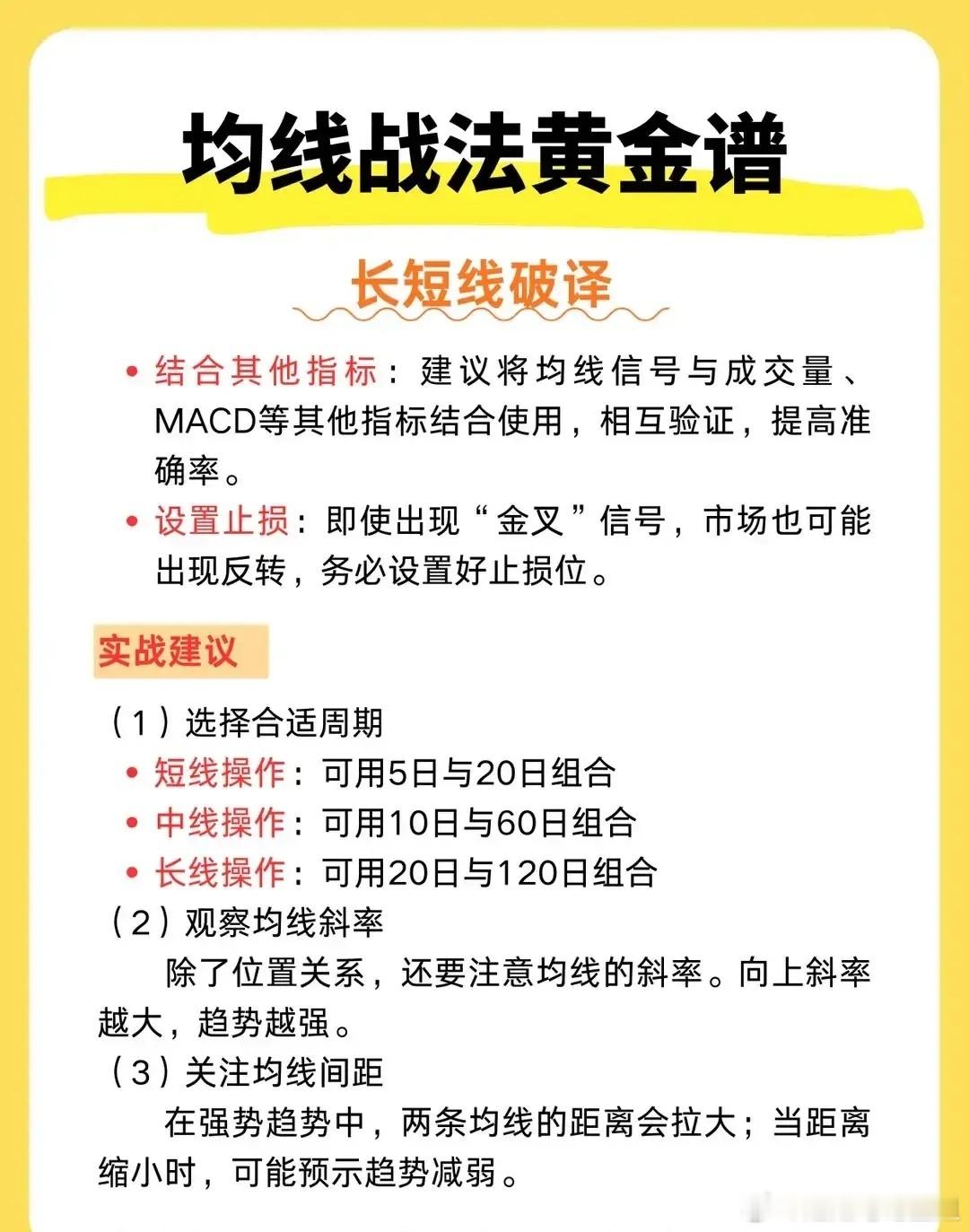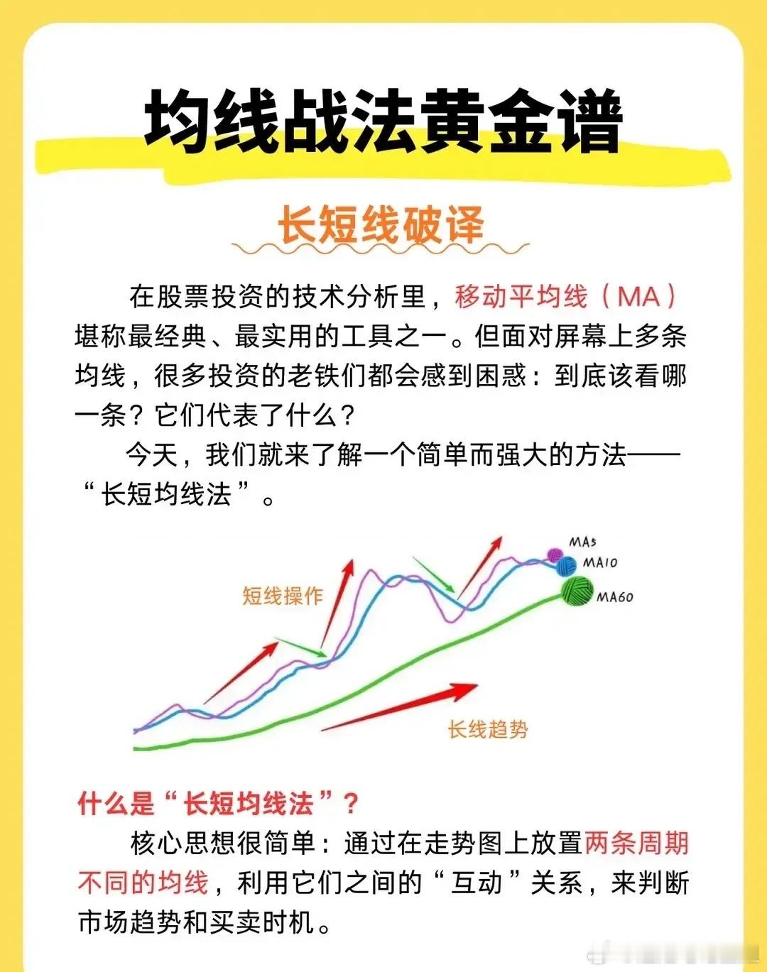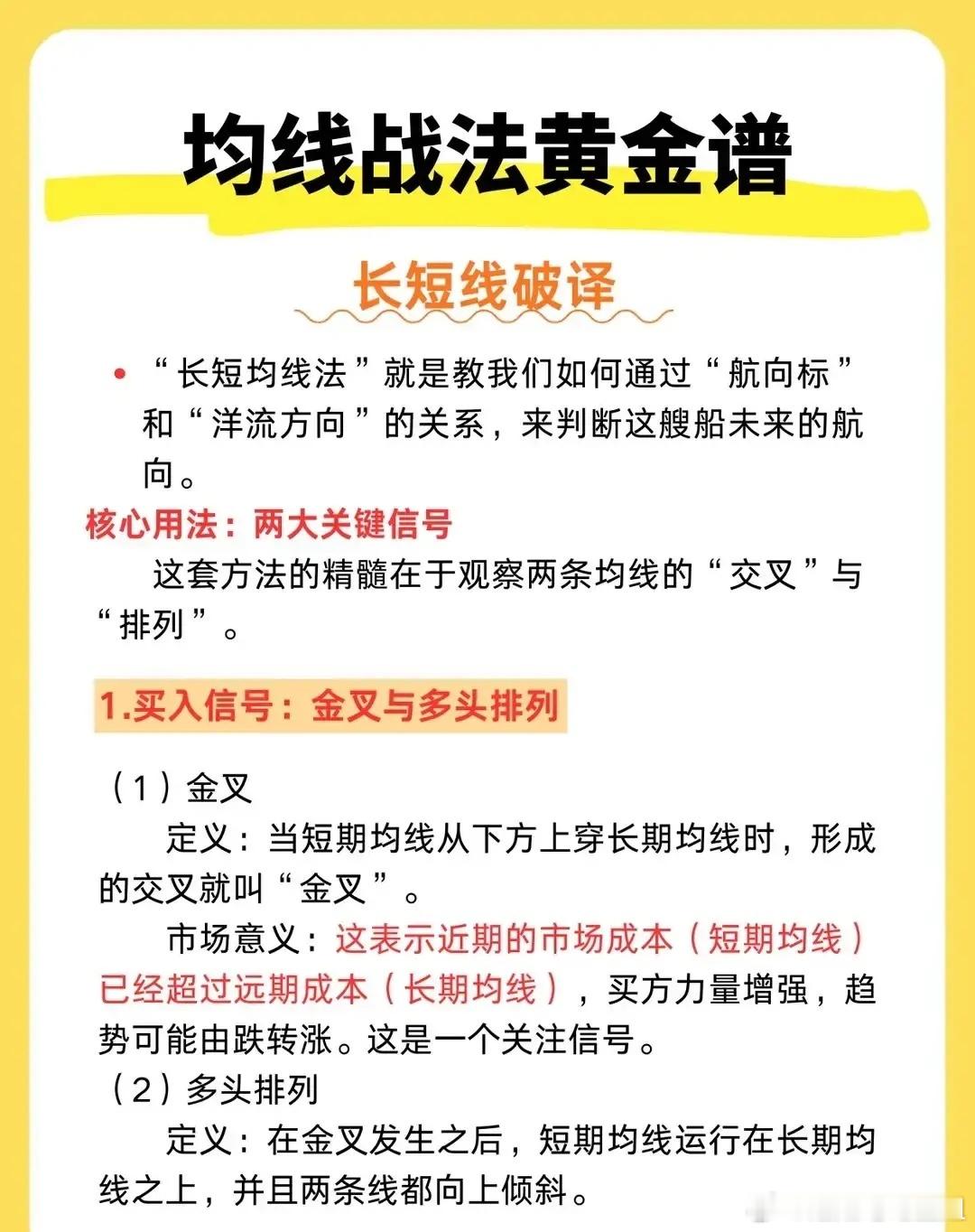 📌 均线战法黄金谱 · 实战清单1️⃣ 基础概念- 均线(MA):某段时间收盘价的平均值,反映市场平均持仓成本。 - 例:5日均线 = 最近5天收盘价均值(短期成本走势)。- 长短均线法:在走势图上放置两条不同周期的均线,通过它们的“互动”判断趋势和买卖时机。 - 短期均线:5日或10日,灵敏,跟踪价格变化快。 - 长期均线:20日(月线)、30日或60日(季线),稳定,代表中长期趋势。 - 比喻:短期均线是船头航向标,长期均线是洋流主流方向。2️⃣ 买入信号1. 金叉 - 定义:短期均线从下方上穿长期均线。 - 含义:近期成本超过远期成本,买方力量增强,趋势可能由跌转涨。2. 多头排列 - 定义:金叉后,短期均线在长期均线之上,且两线均向上倾斜。 - 含义:上涨趋势确立,市场处于多头格局。3️⃣ 卖出信号1. 死叉 - 定义:短期均线从上方下穿长期均线。 - 含义:近期成本下降,卖方占优,趋势可能由涨转跌。2. 空头排列 - 定义:死叉后,短期均线在长期均线之下,且两线均向下倾斜。 - 含义:下跌趋势确认,市场处于空头格局,应等待下一个金叉。4️⃣ 方法优缺点优点- 简单直观,规则清晰,适合初学者。- 趋势性强,能捕捉主要趋势大部分阶段,避免被小波动震出。- 过滤噪音,比单根均线减少无效信号。缺点- 滞后性:趋势确认时可能已错过最佳买卖点。- 震荡市无效:价格无明确趋势时会反复交叉,产生错误信号。⚠ 重要提醒:均线是辅助工具,不是100%准确,需结合其他分析方法。5️⃣ 实战建议1. 结合其他指标 - 与成交量、MACD等配合验证,提高准确率。2. 设置止损 - 即使出现金叉,也要预设止损位,防范反转风险。3. 选择周期 - 短线:5日 + 20日 - 中线:10日 + 60日 - 长线:20日 + 120日4. 观察均线斜率 - 斜率越大,趋势越强。5. 关注均线间距 - 强势趋势中两线距离拉大;距离缩小可能预示趋势减弱。6️⃣ 操作流程示例1. 在K线图添加两条不同周期均线(如5日 & 20日)。2. 观察是否出现金叉/死叉及排列形态。3. 结合成交量、MACD确认信号有效性。4. 确定买卖点后,设好止盈止损位。5. 持续跟踪均线斜率与间距变化,判断趋势强弱。✅ 这样你就可以把“长短均线法”变成一个可重复执行的交易流程,既抓住趋势,又尽量规避震荡市的陷阱。