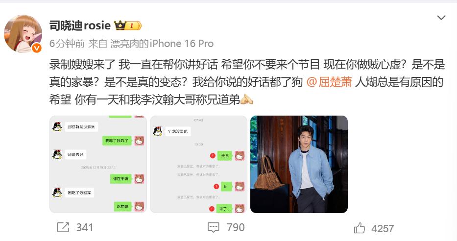 网红司晓迪号称30岁已睡遍顶流:再添一家暴男艺人 网红司晓迪继爆料秦霄贤、李汶翰之后,再在平台无差别爆料,渣翻全网了。 更是称自己30岁已睡遍顶流,自己人生没有遗憾。 2026年1月3日凌晨,晒合照、截图、聊天记录等,点名了10多名男明星,鹿晗、蔡徐坤、黄明昊、范丞丞、林更新及檀健次、周奇等。 司晓迪可以说是“可汗大点兵”,点名的男明星工作室也提前开工,元旦假期还没结束,就开始上班发声明回应澄清。 随着男明星及其工作室声明的发出,司晓迪就开始删博,于是就有网友扒出在外网“排名”。 舆论发酵之后,司晓迪出来辟谣称是假的,让大家不要相信,并在评论区自己排名“Lh得第一”。 本以为爆料结束了,司晓迪在晒聊天记录,爆料增加一名男明星屈楚萧。 从聊天中,有一个1月4日接单的截图,还称他家暴、变态,并表示屈楚萧与李汶翰有得一比,可以称兄道弟了。 家暴中提及的是,男明星屈楚萧打了她闺蜜的闺蜜,她刚开始觉得屈楚萧是她朋友,帮他立人设。 值得一提的是,司晓迪聊天记录显示的是2025年12月19日,晚上深夜的聊天记录。 另外就是今天早晨7点多的聊天,随后就被拉黑。不知道被拉黑是不是昨晚凌晨的爆料。 司晓迪的爆料还在继续,到底事实是咋样,我们静待官方回应。