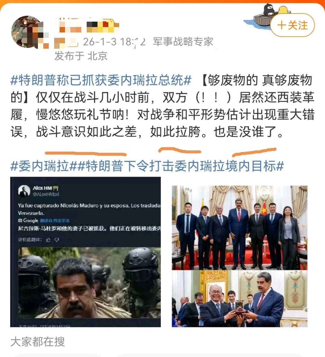 这世界就是个笑话,我们每个人都是笑话的组成因素。天天说文明,天天说人权,天天说自由,一个主权小国的总统说被大国抓了就抓了,然后还有人嘲笑危内瑞拉废物,马杜罗拉垮。这帮人从来不说这完全是一场实力悬殊的强权侵略霸凌!特朗普称已抓获委内瑞拉总统