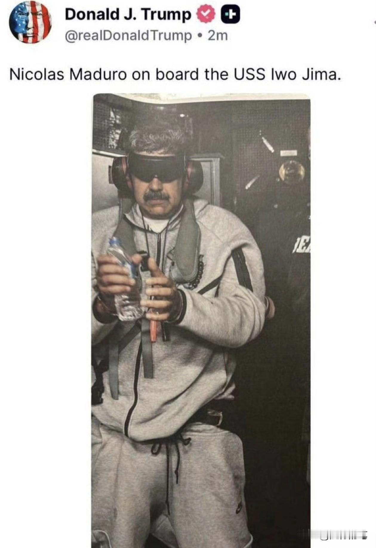 最新,特朗普发布抓到委内瑞拉总统的照片,可以看到马杜罗眼睛被紧紧的蒙住,耳朵又戴着专门隔音的装备,双手戴着手铐,手里只拿着一瓶矿泉水,身上穿的一套灰色卫衣,衣衫不整,看得出当时被抓捕时马杜罗有点狼狈。而特朗普发布照片时,马杜罗已经被带到美国海军硫磺岛号两栖攻击舰(LHD-7)上了,估计很快就会返回美国本土。 特朗普现在的心情全部都是对这次行动的自夸,称赞美军做得多好,感觉这是他的一大功绩一样。