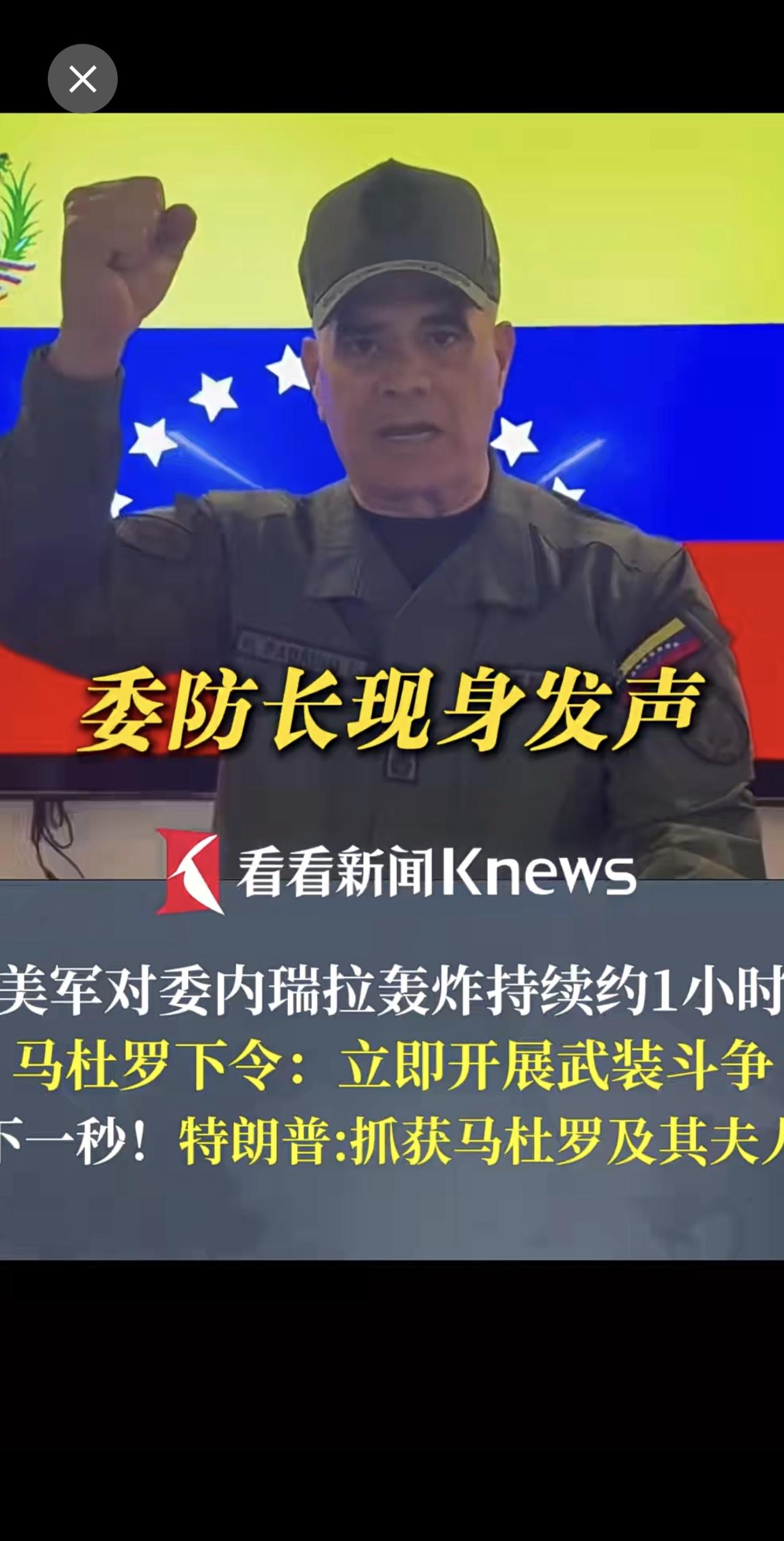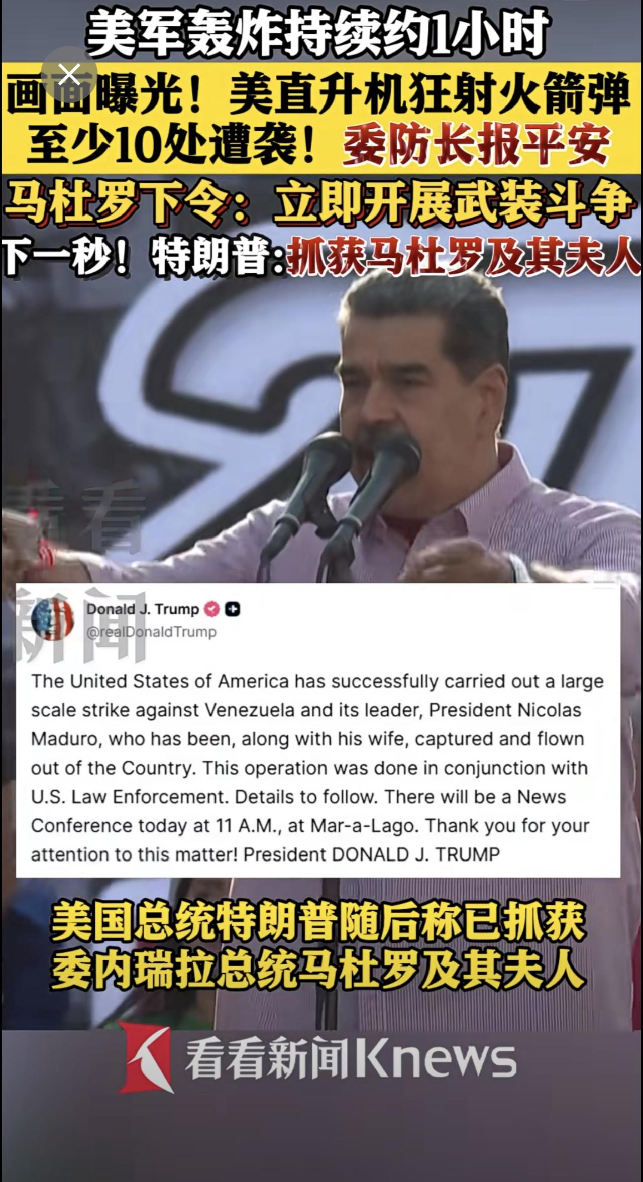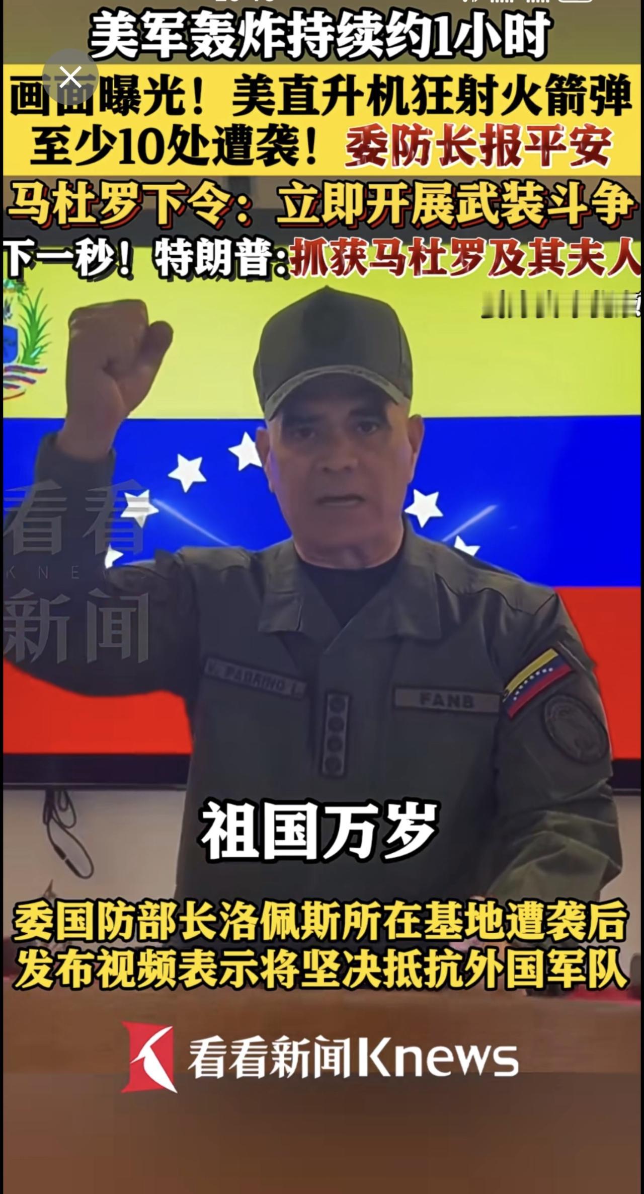 美军轰炸持续约1小时!至少10处遭袭!委防长现身发声 委总统下令立即武装斗争 下一秒!特朗普:已抓获马杜罗及其夫人 点击关注@看看新闻Knews
