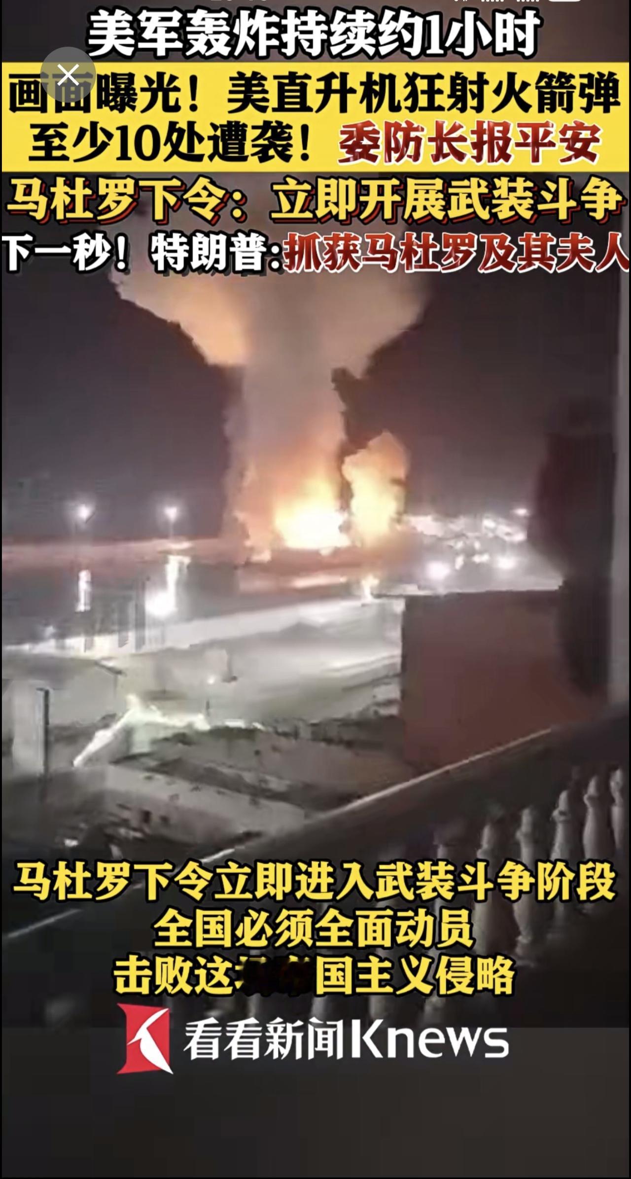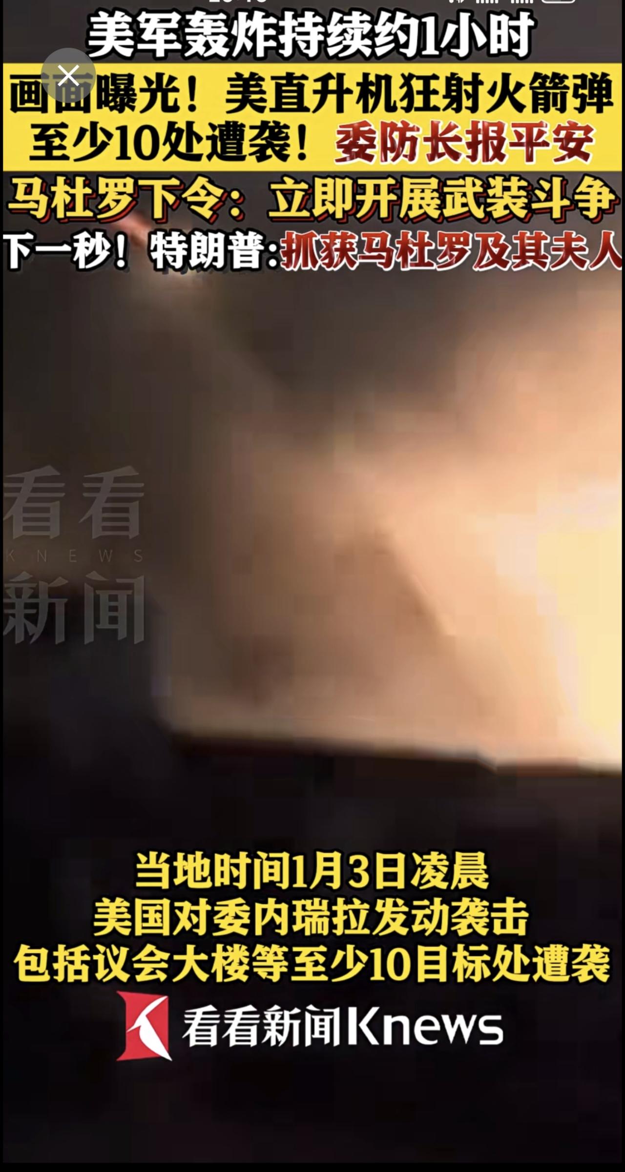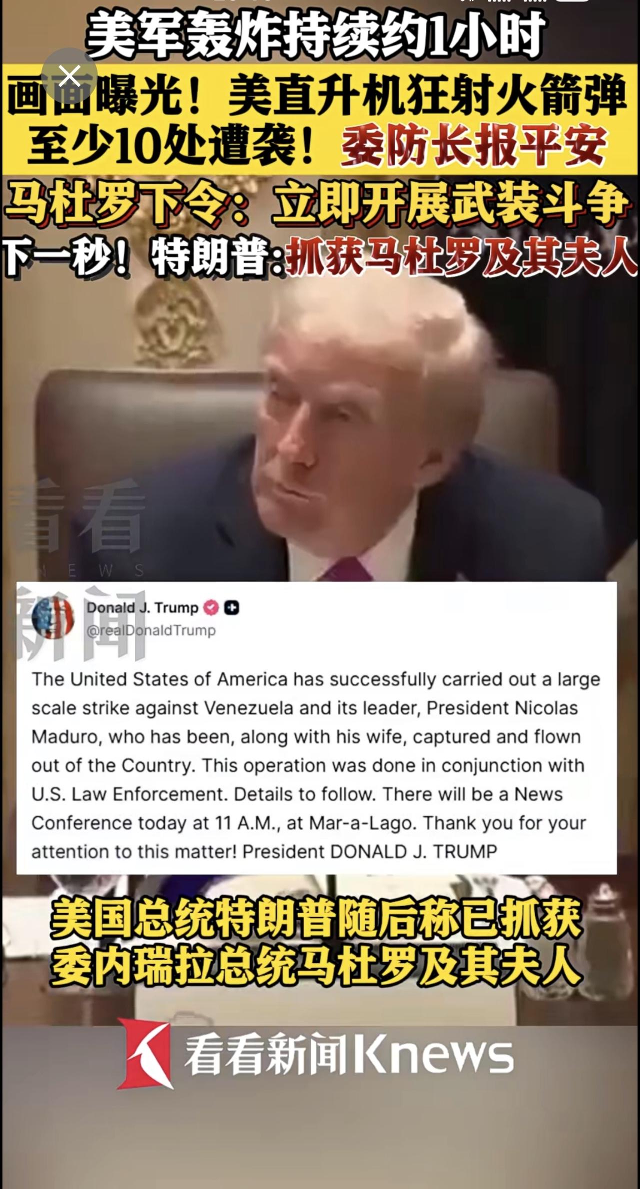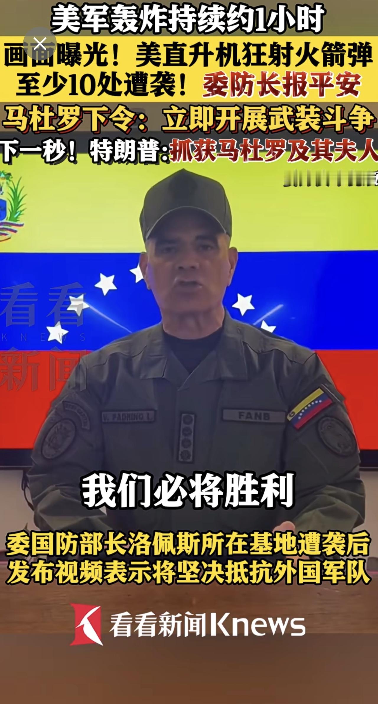 美军轰炸持续约1小时!至少10处遭袭!委防长现身发声 委总统下令立即武装斗争 下一秒!特朗普:已抓获马杜罗及其夫人 点击关注@看看新闻Knews