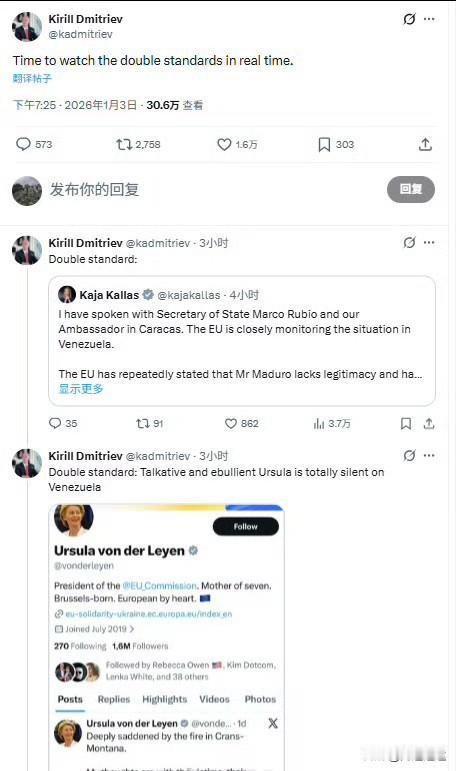 德米特里耶夫批评欧盟领导人双重标准,冯德莱恩和卡拉斯在谈到乌克兰问题时假装“反侵略”,在美军直接侵略委内瑞拉时却要么装傻要么支持侵略。 西方的双标一直如此,而且会传染。国内大部分支持美国和乌克兰的网友似乎也是如此。天天喊乌克兰被侵略。到委内瑞拉全都不说侵略了。加沙也是如此。[吃瓜群众]委内瑞拉