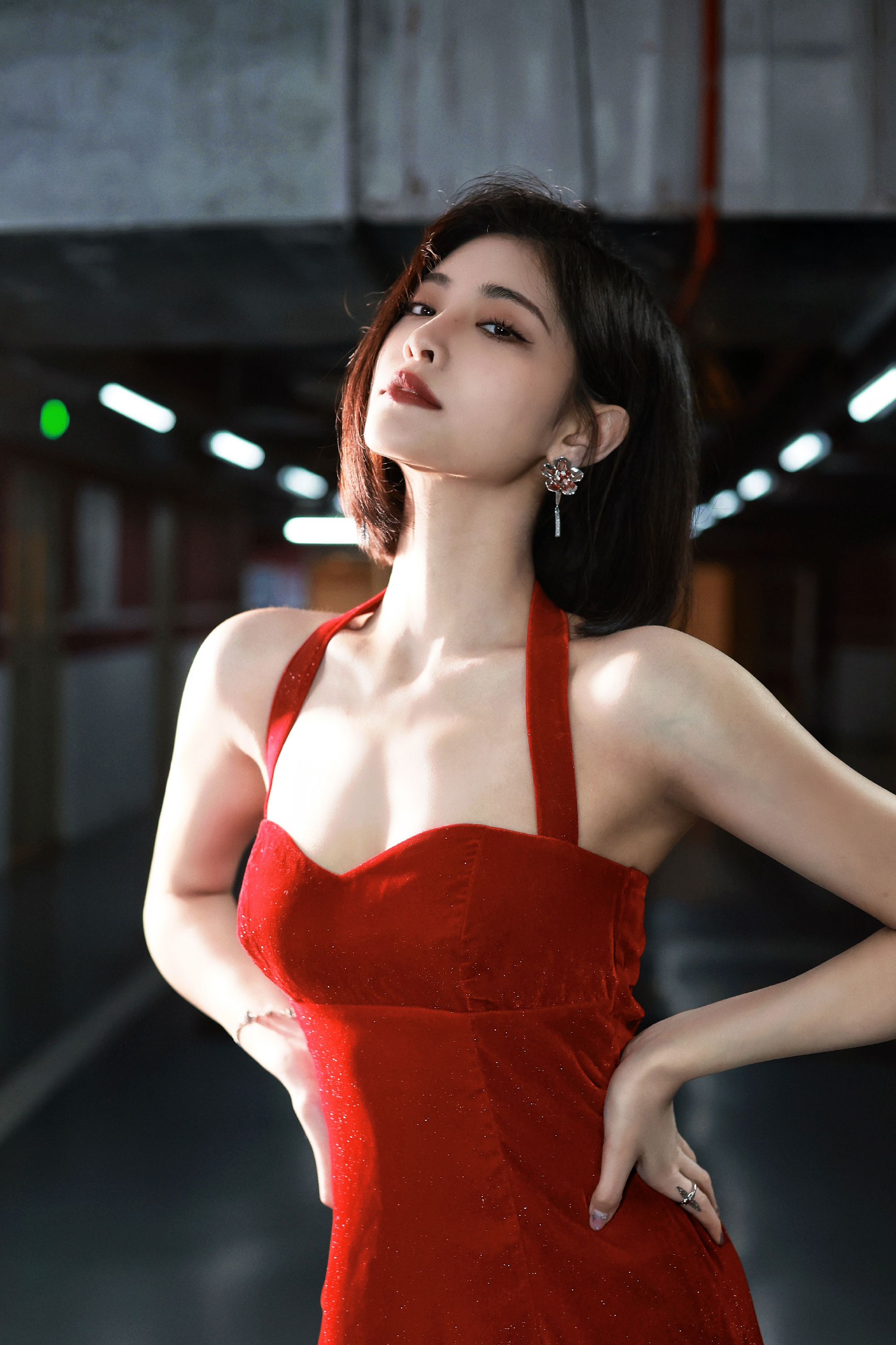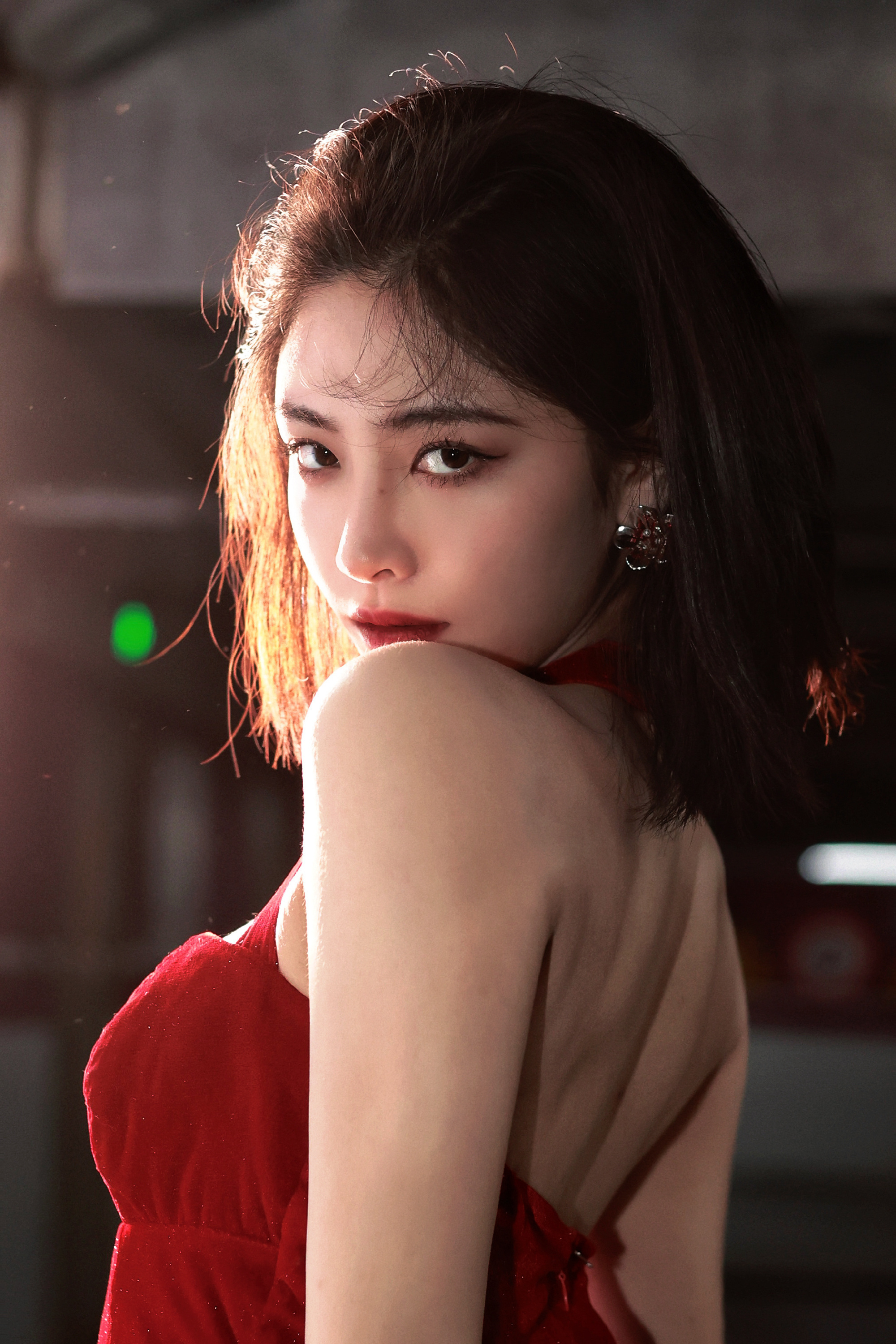 许佳琪,红色吊带裙,冷艳风格大片。许佳琪