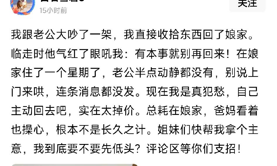 没出息!跟老公大吵了一架,就直接收拾东西回了娘家。临走时他气红了眼吼我:有本事就别再回来!有网友发文说,她在娘家住了一个星期了,老公半点动静都没有,别说上门来哄,连条消息都没发。现在她是真犯愁,自己主动回去吧,实在太掉价。总耗在娘家,爸妈看着也操心,根本不是长久之计。她到底要不要先低头? 关键看是因为什么吵架的,如果是你做错了可以主动认错回去,如果不是你的错,他也不道歉不来接,那就坚决不回去,哪怕不呆娘家,出去找份事做都可以。 主要是你们夫妻吵架是什么原因造成的,如果是原则性问题那肯定不能让步,既然你走出来了要把问题处理清楚后回去。如果不是原则性问题,为了家里一些琐事吵架的,那没有什么面子不面子的。两个人总是要有一个人先服软,这个服软不是认可,而是大家让一步。在男人认为他自己没有错的情况下,你走出了家了,他一般是不会来叫你或者是打电话给你。所以,还是自己回去,主动沟通一下,就解决了,不是把事情升级。 还有网友发文说,现在应该是父母送你去夫家再痛骂你一顿!这给你台阶下又给女婿颜面。她俩第一次生气,他说,你回娘家我不去接你!我说,死我也死在这房子里,这也是我的家!父母也说,高兴时候你们谁来都欢迎,你们闹矛盾自己在家解决,别回来!夫妻吵架,双方最忌翻旧账,拿人对比,连带对方父母家庭,其实妻子最想要一个台阶,老公随势递个垫子,什么事就没有了!夫妻吵架感悟 对老公抱怨 夫妻间吵架 对老公表达不满 跟爱人吵架 以后和老公生气 跟婆家人生气