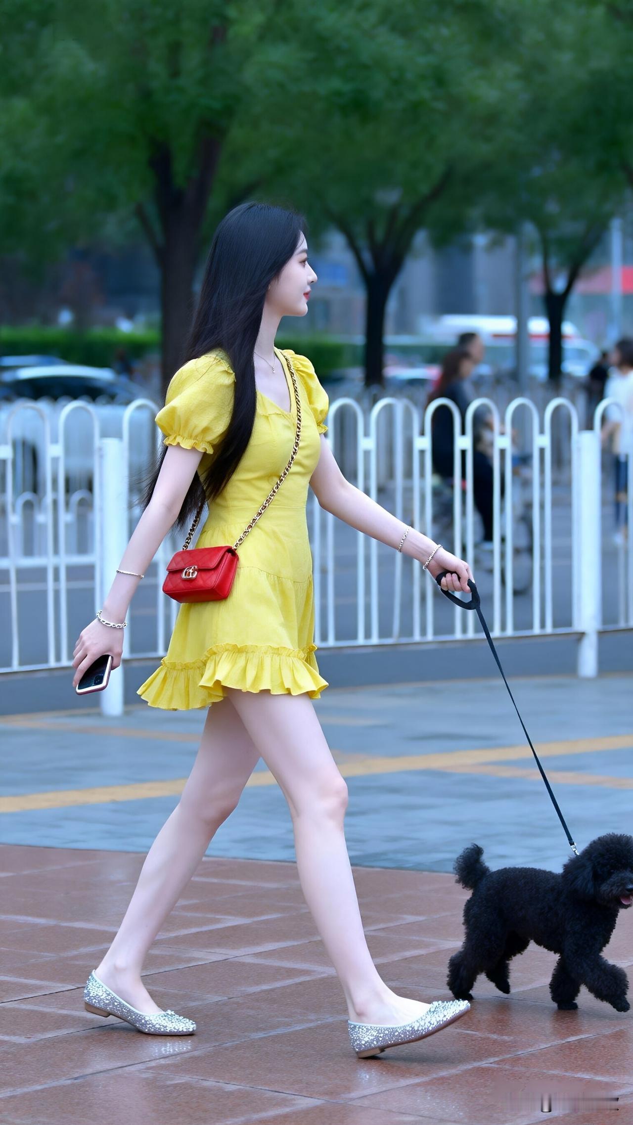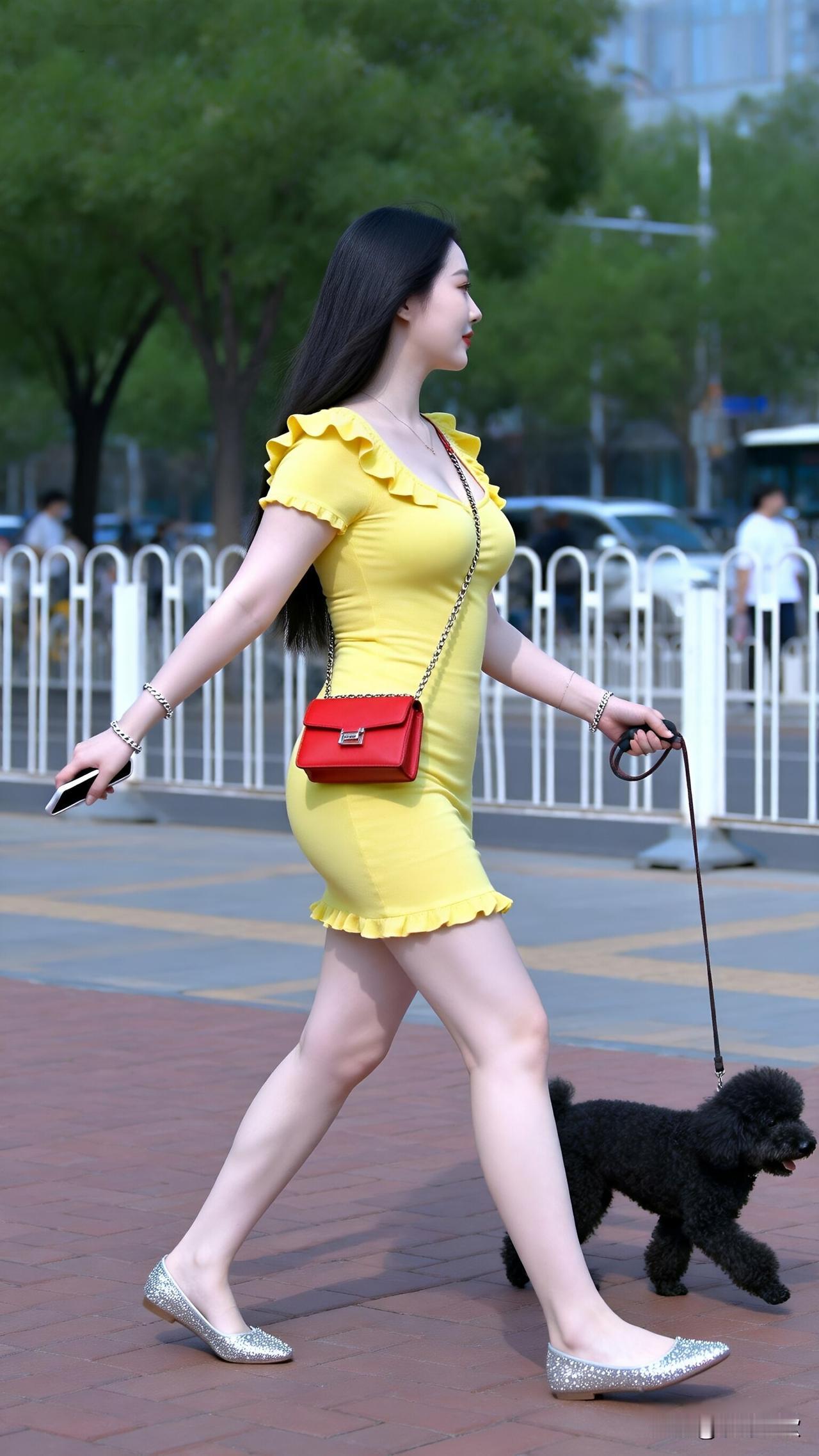 街头惊现“柠檬女孩”,清新风暴席卷而来! 你是否也被这抹亮眼的黄吸引?街头,一位长发飘飘的女子牵着黑色小狗悠然踱步。她身着一袭紧身黄色连衣裙,宛如一颗新鲜的柠檬,散发着清新活力。荷叶边的设计增添了几分俏皮,修身的款式完美展现她的身材。 她脚踩银色亮片平底鞋,步伐轻盈,仿佛自带光芒。红色的斜挎包成为点睛之笔,为整体造型增添一抹热情。这哪里是遛狗,分明是在街头演绎一场时尚秀! 姐妹们,是不是已经心动不已,想要get同款穿搭了?快来评论区留言,一起探讨如何成为街头最靓的仔! 街头时尚风向 柠檬黄穿搭 俏皮女孩风 时尚遛狗装