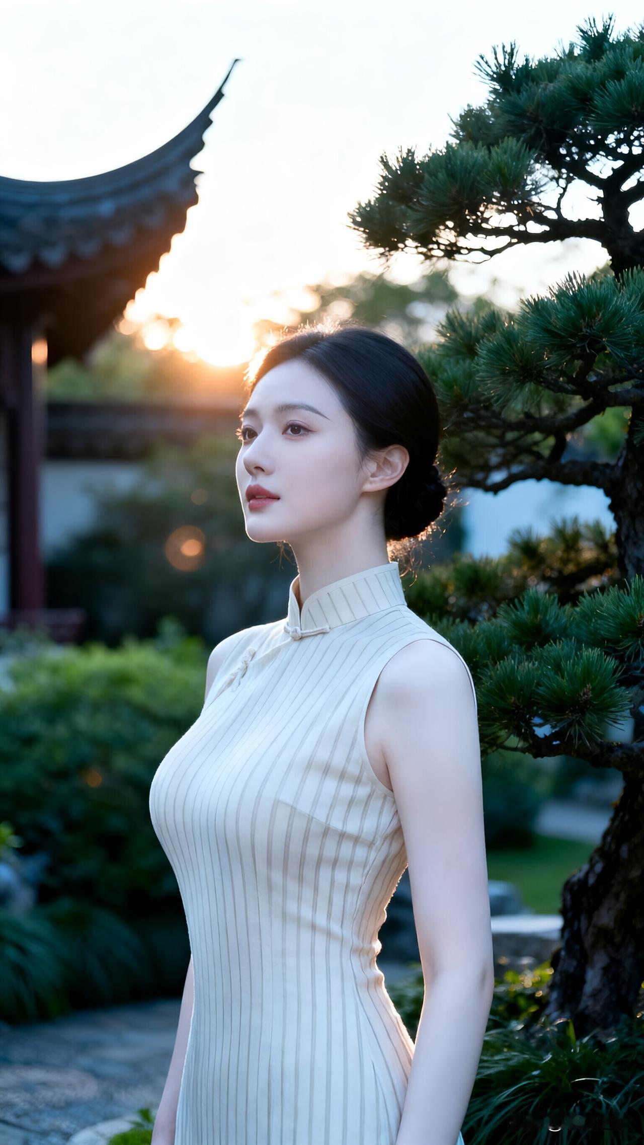 🔥旗袍佳人,夕阳下的绝美邂逅!🌹 夕阳的余晖洒满园林,一位身着浅色竖条纹旗袍的女子静静伫立,仿佛从旧时光中走来的画中人。旗袍贴身剪裁,勾勒出她曼妙的身姿,无袖设计更添几分优雅与温婉。她的黑发轻挽,妆容精致淡雅,眼神深邃而宁静,透露出一种说不出的故事感。 这画面,美得让人心醉!旗袍作为中国传统服饰的瑰宝,总能以它独有的韵味,触动我们内心最柔软的部分。无论是古典的园林,还是现代都市的街头,一件合身的旗袍,就能让女子瞬间成为焦点,绽放出无限魅力。 你是否也被这份古典美所打动?快来评论区分享你心中的旗袍情结吧!💬 旗袍佳人 古典园林之美 夕阳下的邂逅 传统服饰韵味
