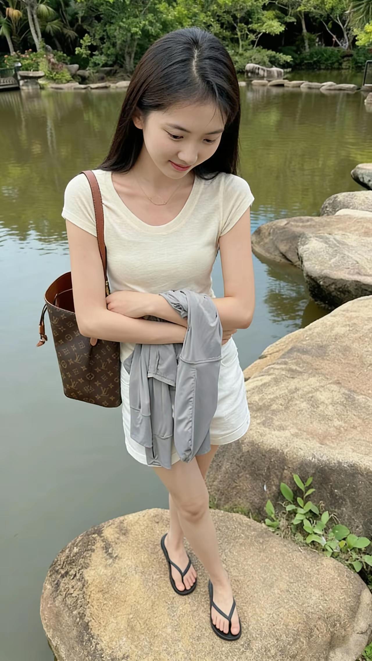 阳光下的清新少女,在溪边轻抚流水,感受自然的美好。