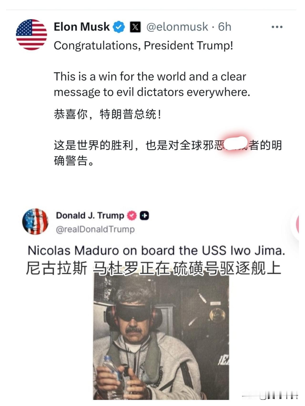 马斯克这马屁拍的 今天凌晨,马斯克个人社交媒体转发了特朗普公开委内瑞拉总统特马杜罗被抓获后的照片,并恭喜特朗普,声称这是世界的胜利,顺带对剩余几个抱团国进行了威胁及冷嘲热讽。不要忘记了,委内瑞拉是联合国合法会员,也并未受到联合国制裁。但是特朗普在没有联合国授权,甚至连国会授权都没有的情况下入侵别国,难道这不叫侵略?这开了一个先例,以后大国只需凭借武力就可以巧夺豪取了。