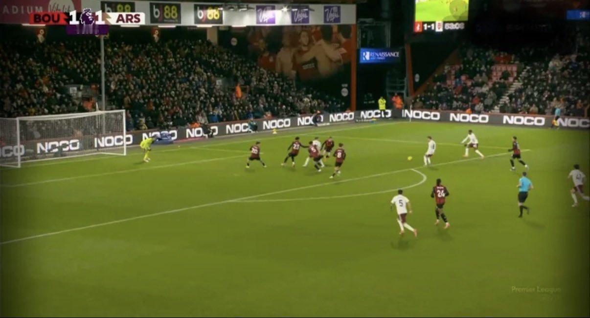 【哲凯赖什的作用】英超第20轮,阿森纳客场3-2击败伯恩茅斯。下半场第54分钟,在阿森纳打入第二球的过程中,哲凯赖时充分体现了自己不可替代的作用。 在进球过程中(详见图3),当马丁内利把球争顶下来时,皮球其实并未交到哲凯赖什的控制范围内。但哲凯赖什利用自己的身体条件,顶住了两名防守球员,把球稳住,为厄德高创造了机会,厄德高随即助攻赖斯破门得分。 这粒进球帮助阿森纳反超比分,十分关键!作为大中锋,即便不进球,哲凯赖什在阿森纳的作用也是不可替代的。阿森纳