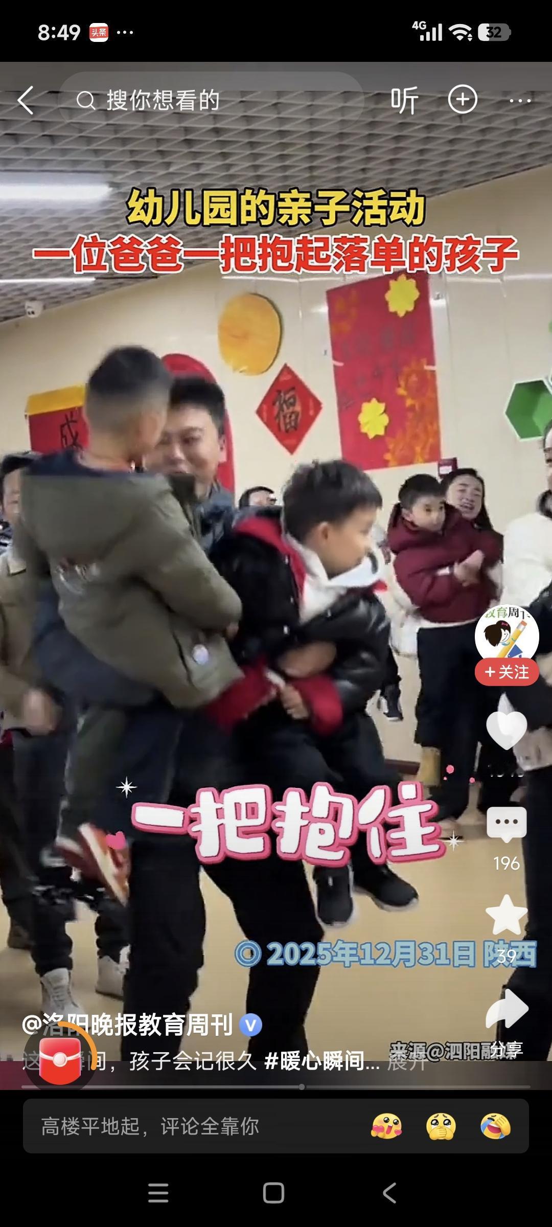 这个男人,真的值得嫁! 元旦幼儿园搞亲子活动,别的娃都被父母举高,有个小朋友爸妈没来,只能站在旁边,眼巴巴的看着,小眼神里全是羡慕。 这时,旁边的爸爸二话不说,腾出一只手,直接把这孩子抱了起来,高高举起。孩子当场笑开了花,那一瞬间,感觉得整个活动都暖了。 小小的一个举动,温暖的或许是小男孩的一辈子。 这个男人,有温度、有力量、有爱,对别人的孩子如此关爱,日常对自己的老婆孩子就不用说了,估计连拧瓶盖都带着温柔[呲牙] 不知道是哪个姑娘这么幸运,嫁了这么个暖男,羡慕哭了[星星眼]