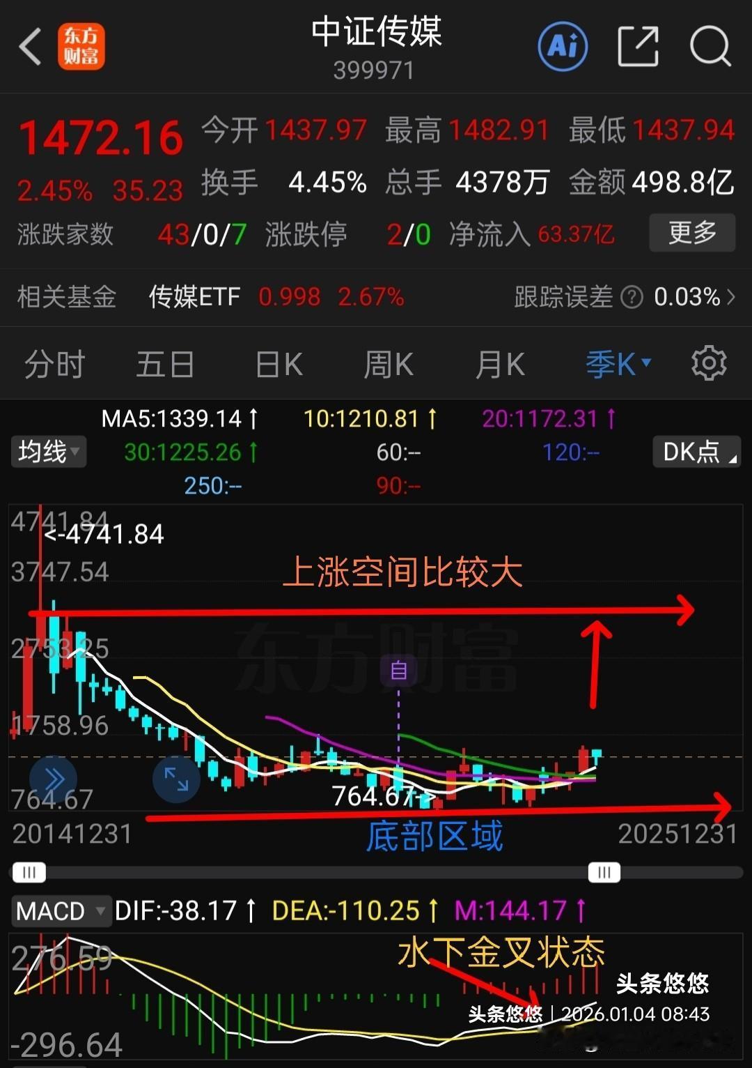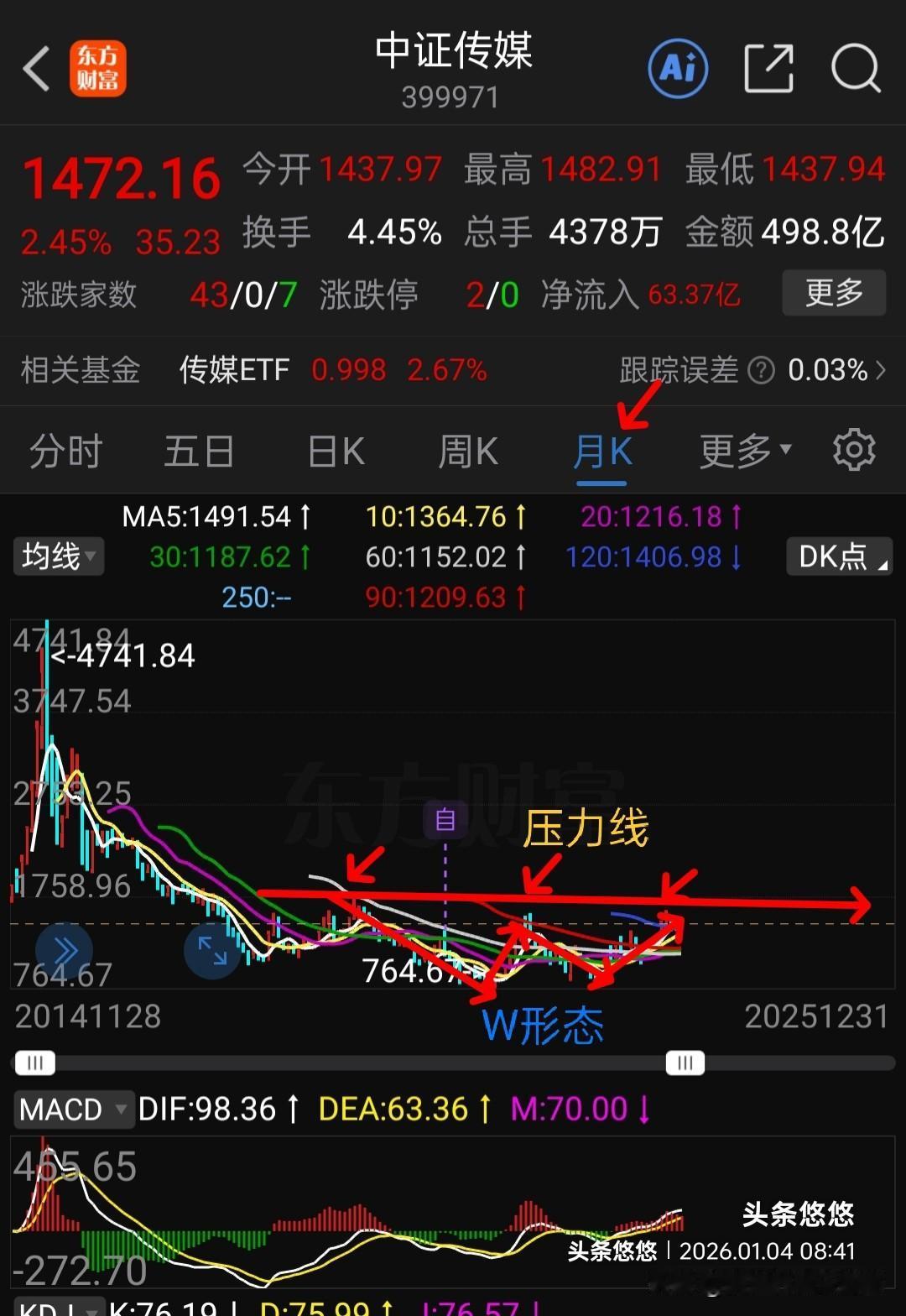 26年不可忽视的板块是它?当下,大家都把目光集中在卫星通信,机器人,有色金属等热门板块,别忘了有一个板块上涨潜力也不小,它就是传媒板块。 下图是中证传媒周线、月线、季线走势图,从它的整体位置来说,目前还处于历史底部区域,大方向反弹空间还很大,如果下周能站上5月线支撑,后期继续看涨。 周线运行在一个箱体内(如下图一),目前接近箱体上沿附近,突破过去将打开上涨空间。 月线目前是一个W底形态(如下图二),目前还没有突破颈线压力区域,假如后面突破这个颈线压力位,将开启新的上涨行情。 从季线走势分析(如下图三),macd水下金叉上行趋势,圆弧底形态,底部构筑已经完成,长期上行趋势。 节前最后一个交易日中证传媒反弹近3%,一举强势突破60日线压力,为短线反弹奠定基础。 中证传媒指数25年上涨27%,上涨幅度不算多,年线处于底部,技术指标趋势向上运行,预计26年会有不错的行情,感觉传媒比有色金属反弹空间大(有色金属25年反弹比较大,处于高位)。 以上观点仅供参考不构成投资依据,点赞转发关注投资理财不迷路。