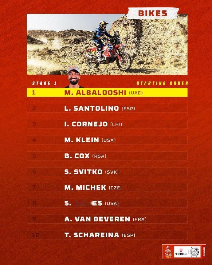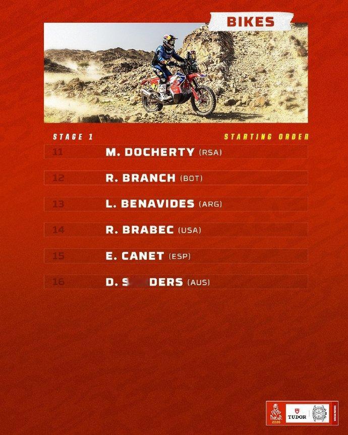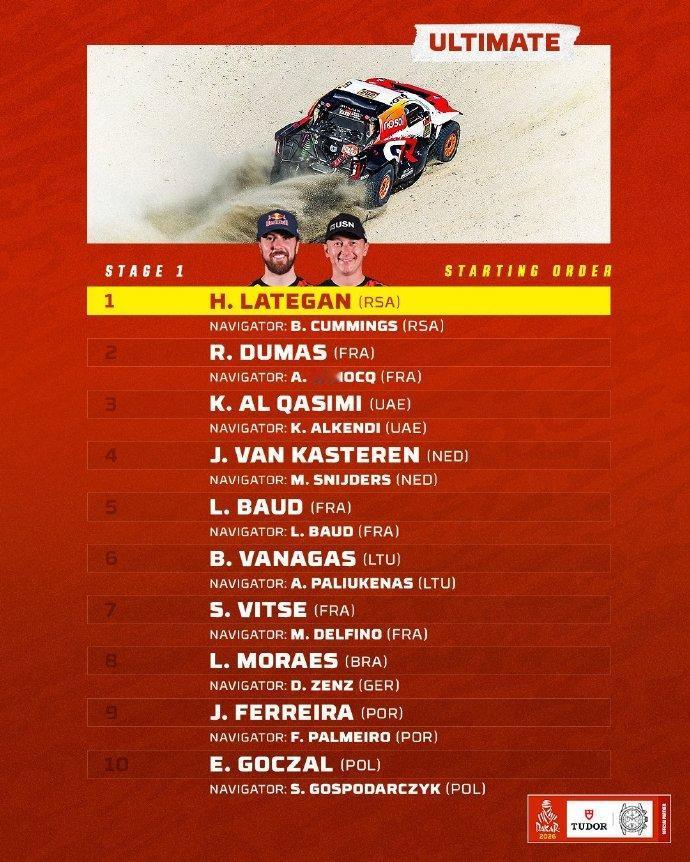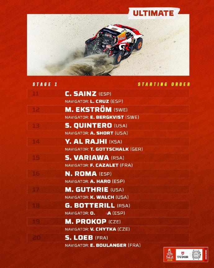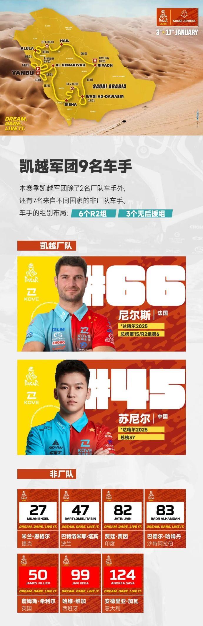 赛车:2026达喀尔拉力赛正式启程! 中国军团阵容再创新高:19台赛车出战2026达喀尔。 2026达喀尔拉力赛将于1月3日-17日在沙特举行,14天的赛程,全程8000公里。中国军团参赛阵容再创新高,达到19台赛车,其中实力雄厚的九江车队就有6台赛车,以下是具体参赛名单: 一、九江车队 车号 车队 车手 领航 215 九江车队 张彪彪 马文科 243 九江车队 鹿丙龙 沙贺 255 九江车队 赵玉乔 桂海波 259 九江车队 陶永明 付立国 261 九江车队 徐苯炀 田雷 271 九江车队 范高翔 赵凯 二、韩魏车队 220 韩魏车队 韩魏 马利 245 韩魏车队 田坡 哈斯牧仁 262 韩魏车队 王国瑞 田宇 三、赛格威 1000 赛格威车队 本杰明·帕斯夸尔(BENJAMIN PASCUAL) 1001 赛格威车队 杨洁 1002 赛格威车队 易光辉 四、凯越机车 45 凯越厂队 苏尼尔 66 凯越厂队 尼尔斯·泰里克(NEELS THERIC) 五、红陀车队 23 红陀车队 马丁·米切克(MARTIN MICHEK) 98 红陀车队 梅森·克莱因(MASON KLEIN) 108 红陀车队 石浩宇 六、零公里车队 40 零公里车队 赵宏義 56 零公里车队 张敏 2026达喀尔第一赛段:汽车组和摩托车组的发车顺序(附图)