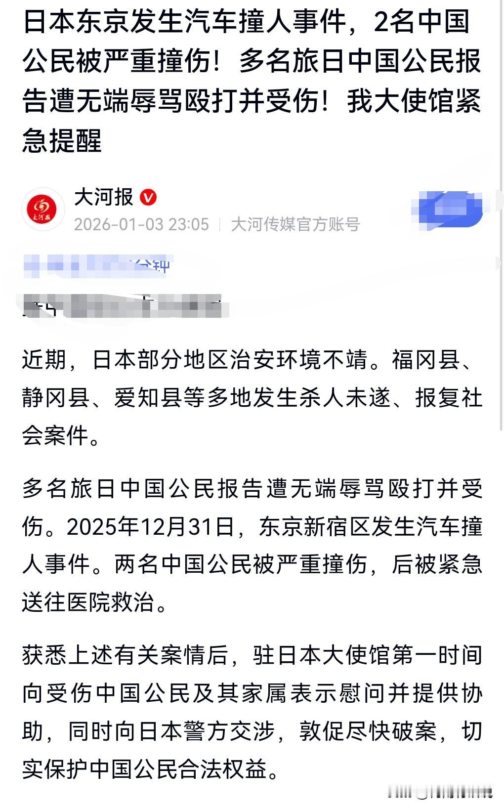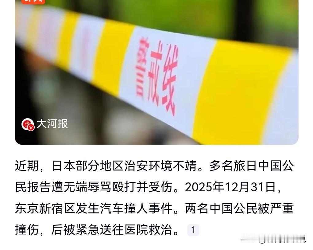 真的是岂有此理,撞人的人竟然跑路了,希望日本一定要尽快破案,抓住这个撞人的人。 2025年12月31日,两名中国公民被严重撞伤。 近期日本的治安不太行,发生多起针对中国人的辱骂殴打事件。 所以不要去日本旅游,没什么好去的,连安全都无法保障的地方有什么好去的。