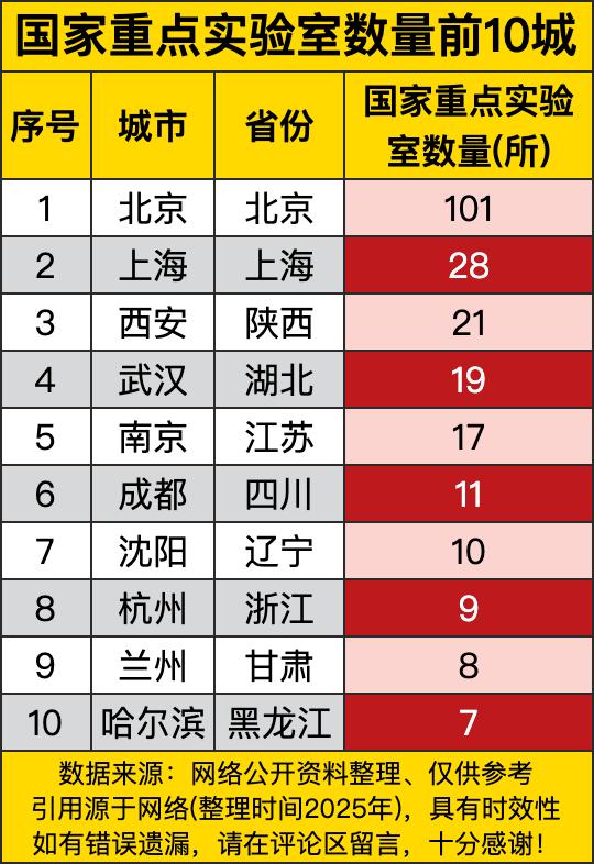 北京那绝对是遥遥领先啊,101所的惊人数量,就像科研界的“超级大富翁”。别人还在起跑线上琢磨呢,人家已经在科研成果的高地上插满了旗子,妥妥的科研界“带头大哥”,这实力,让人不得不服! 再瞅瞅上海,28所的量也不容小觑。它就像是科研赛道里的“优雅绅士”,虽然没有北京那么霸气侧漏的数量,但凭借着自身的魅力和底蕴,在科研的时尚秀场上也是闪闪发光,各种前沿研究搞得有声有色,时刻吸引着科研界目光。 然后是西安、武汉这些城市。西安有21所,武汉有19所,它们就像科研江湖里的“名门大派”。有着深厚的科研功底和丰富的人才储备,门下弟子们在各个领域大显身手,在古都和江城的土地上书写着科研的传奇故事,不断为国家的科研事业添砖加瓦。 最后看看排名靠后的一些城市,像沈阳、杭州等。它们虽然在数量上没有排到前面,但也都是科研领域的“潜力股”。就像武侠小说里那些初出茅庐却天赋异禀的少侠,正憋着一股劲儿搞研发、育人才,说不定哪天就能来个弯道超车,在科研江湖里闯出一片属于自己的天地呢!