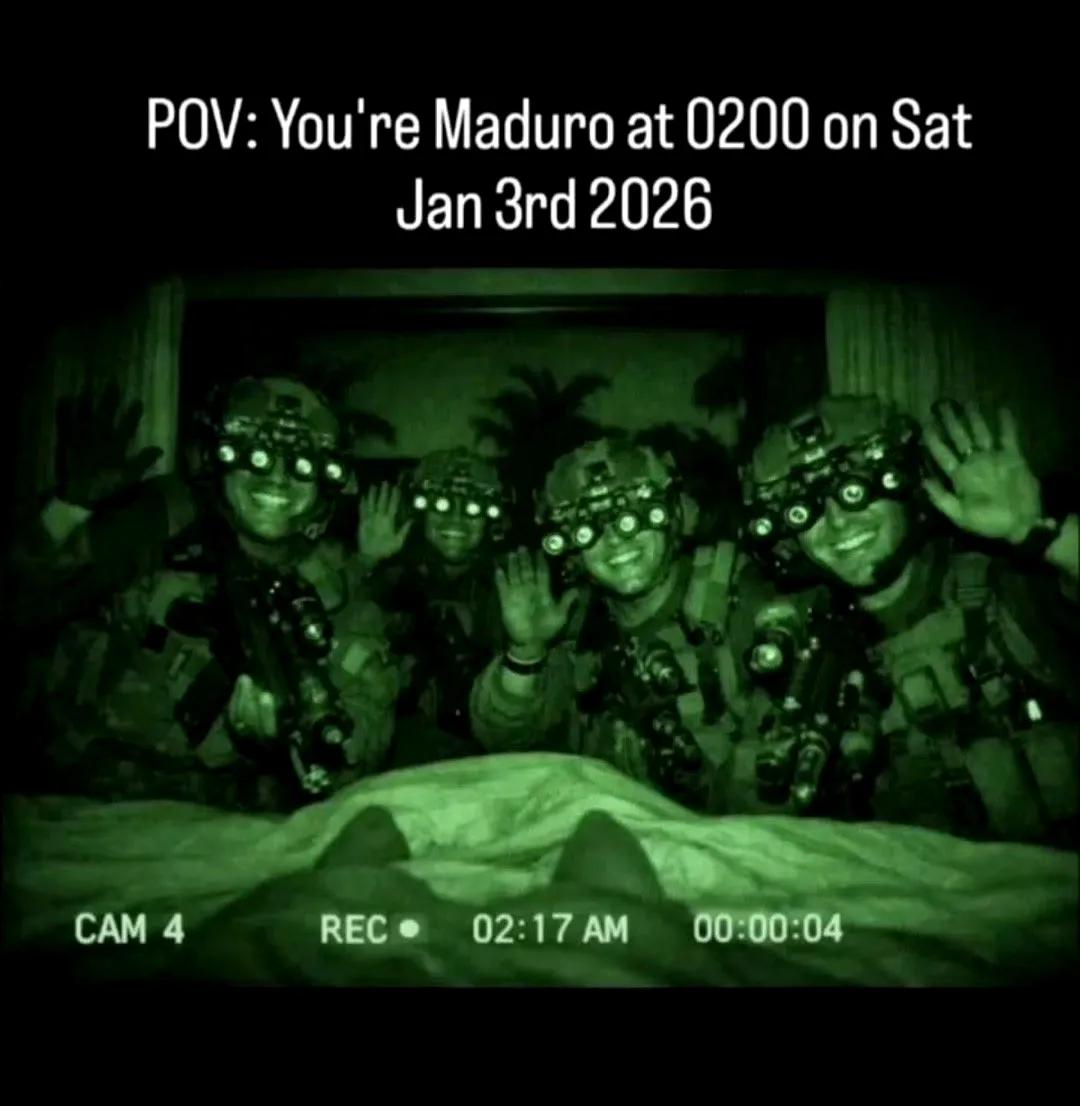 这是美国媒体发布的: 委内瑞拉总统马杜罗昨天凌晨醒来时,被美国特种部队抓走前的视角画面…… 几名美国特种部队成员好像正在微笑着向马杜罗打招呼。 对于马杜罗来说,简直就是一场梦游,发生的太快了,等到完全明白时,已经飞到了美国纽约联邦法院。