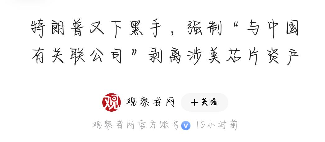 特朗普又对中国下黑手!当地时间1月2日,特朗普发布行政命令,再次以所谓“国家安全”为由,下令强制剥离瀚孚光电(HieFo)公司收购的半导体相关资产,理由荒唐至极——仅因该公司“由一名中方公民控制”,便被扣上了威胁美国安全的帽子。 熟悉美国对华政策的人都清楚,这种操作并不是第一次出现。这些年,“国家安全”成了美国打压中国企业的万能借口,只要是中国资本参与、中国公民主导的科技相关业务,不管有没有实际风险,都可能被拿出来做文章。 从之前否决蚂蚁金服收购速汇金,到要求碳云智能出售美国公司股权,再到把多家中国科技企业列入出口管制清单,美国的打压手段越来越直接,范围也越来越广。 更值得注意的是,这种打压已经跨越了党派界限,不管是哪一届政府,都把遏制中国科技发展当成了重要目标,而所谓的“安全审查”,早就变成了服务于政治目的的工具。 这次针对瀚孚光电的行政命令,背后还有更耐人寻味的政策逻辑。就在前不久,美国政府刚宣布允许英伟达等企业向中国出口部分高端AI芯片,条件是要从销售收入中抽取高达25%的分成;同时又宣布将对中国半导体产品加征关税的时间推迟到2027年6月。 一边是有条件地“放行”,一边是毫无征兆地“叫停”,看似矛盾的操作,本质上都是同一个思路:只允许符合美国利益的技术流动,一旦发现可能让中国企业获得发展机会,就立刻动用行政力量干预。 这种“可交易、可升级、可回缩”的策略,比单纯的全面遏制更具掠夺性,既想赚中国市场的钱,又不想让中国在科技领域实现突破。 美方的这些做法,表面上是针对个别企业,实际上伤害的是全球产业链的稳定和公平竞争的市场秩序。 瀚孚光电的收购案本身就是美国本土企业之间的资产转让,只是因为管理者的国籍背景就被强行干预,这让所有在美经营的外资企业都得捏一把汗——今天可以因为国籍问题否定这笔交易,明天是不是就能用同样的理由打压其他企业? 这种不确定性会严重打击企业的投资信心,也让美国所谓的“市场开放”变成了一句空话。就连美国自己的行业从业者都看得明白,把正常的商业行为政治化,最终只会导致技术交流受阻、市场活力下降,反而会拖慢自身产业的发展步伐。 更有意思的是,美国政府嘴上喊着“维护国家安全”,实际行动却暴露了内心的焦虑。这些年,中国企业在芯片领域的自主研发步伐从未停止,华为公布了昇腾AI芯片的迭代路线图,阿里、腾讯等互联网巨头也在加大芯片研发投入,越来越多的国产芯片开始在市场上崭露头角,逐步打破了国外企业的垄断。 美方越是急于通过行政手段打压,越能说明其在部分技术领域的优势正在缩小。毕竟,真正的安全来自自身的实力提升,而不是通过遏制别人来维持领先。 全球经济一体化的今天,没有任何一个国家能孤立发展,科技的进步更是需要开放合作的环境。把“国家安全”当成打压竞争对手的挡箭牌,滥用行政力量干预商业活动,不仅违背了市场经济的基本规律,也会让美国在国际社会失去更多信任。 瀚孚光电的遭遇只是一个缩影,背后反映的是单边主义与全球化潮流的碰撞,是霸权思维与公平正义的较量。 当“国籍”成为商业合作的绊脚石,当“猜测”取代“证据”成为政策依据,全球市场的信任基础正在被一点点侵蚀。 未来,这样的打压还会持续多久?那些标榜“自由开放”的国家,会不会真正回归理性的合作轨道?面对不公平的对待,企业该如何自保,国家又该如何应对?这些问题,值得每个关注全球发展的人在评论区留下自己的思考。