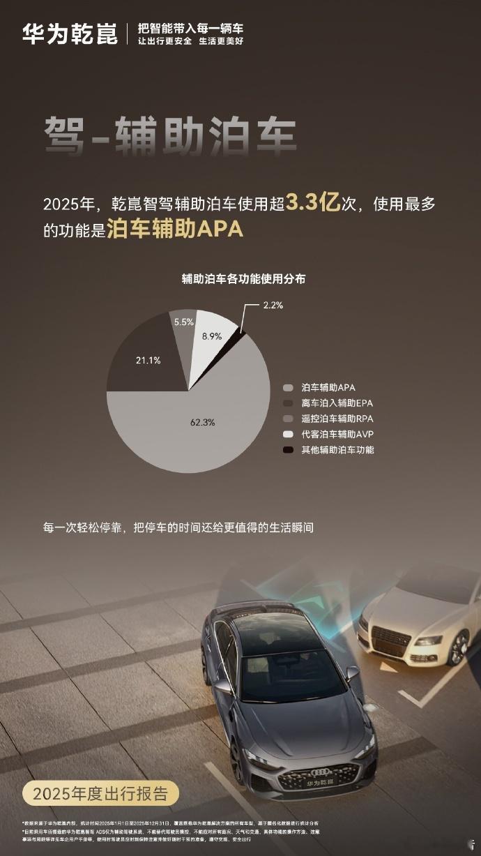 华为乾崑发布2025年度出行报告华为乾崑发布2025年度出行报告:车位到车位功能全年使用超3000万次,覆盖全国超100万个停车场;辅助泊车调用3.3亿次,APA占62.3%;辅助驾驶里程54.2亿公里;主动避碰212万次,平均每位车主被帮助约1.6次,车辆与行人/非机动车避险分别占41%、55%;活跃智驾用户超130万,占比98%。汽场全开华为乾崑新能源汽车