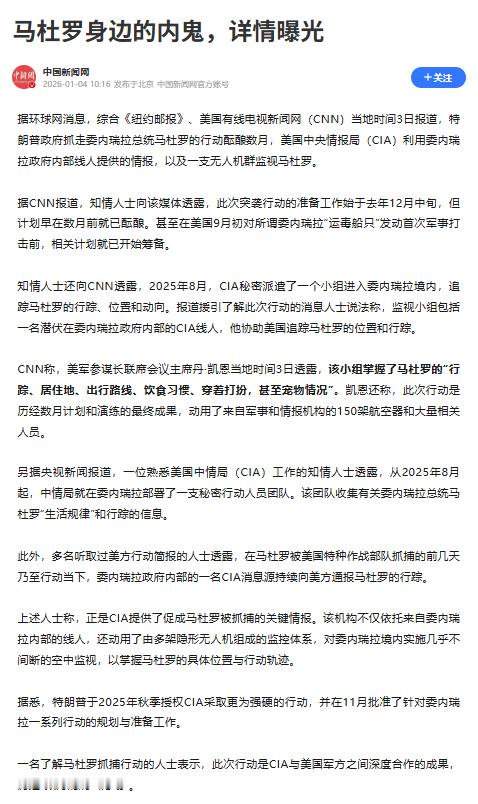 马杜罗身边内鬼详情曝光 CIA于2025年8月向委内瑞拉派遣特遣小队,同步策反一名"与马杜罗关系密切"的高级线人,他长期监控马杜罗行踪,并在抓捕行动中实时传递其确切位置。据悉,该线人不仅日常记录马杜罗的作息规律、住所安保部署及活动路线,还在美军行动前持续数日向美方通报其动态,并在抓捕当天提供实时定位。委内瑞拉虽然拥有俄制S-300防空导弹、苏-30战机等装备,但是在美军直升机低空突入境内时未遭有效拦截,成了摆设。内鬼不但提供情报告诉美军在哪里抓马杜罗,估计还瘫痪了防空系统报,导致便携式防空导弹等武器未被启用,使美军得以长驱直入。委内瑞拉副总统代行总统职权 热点观点