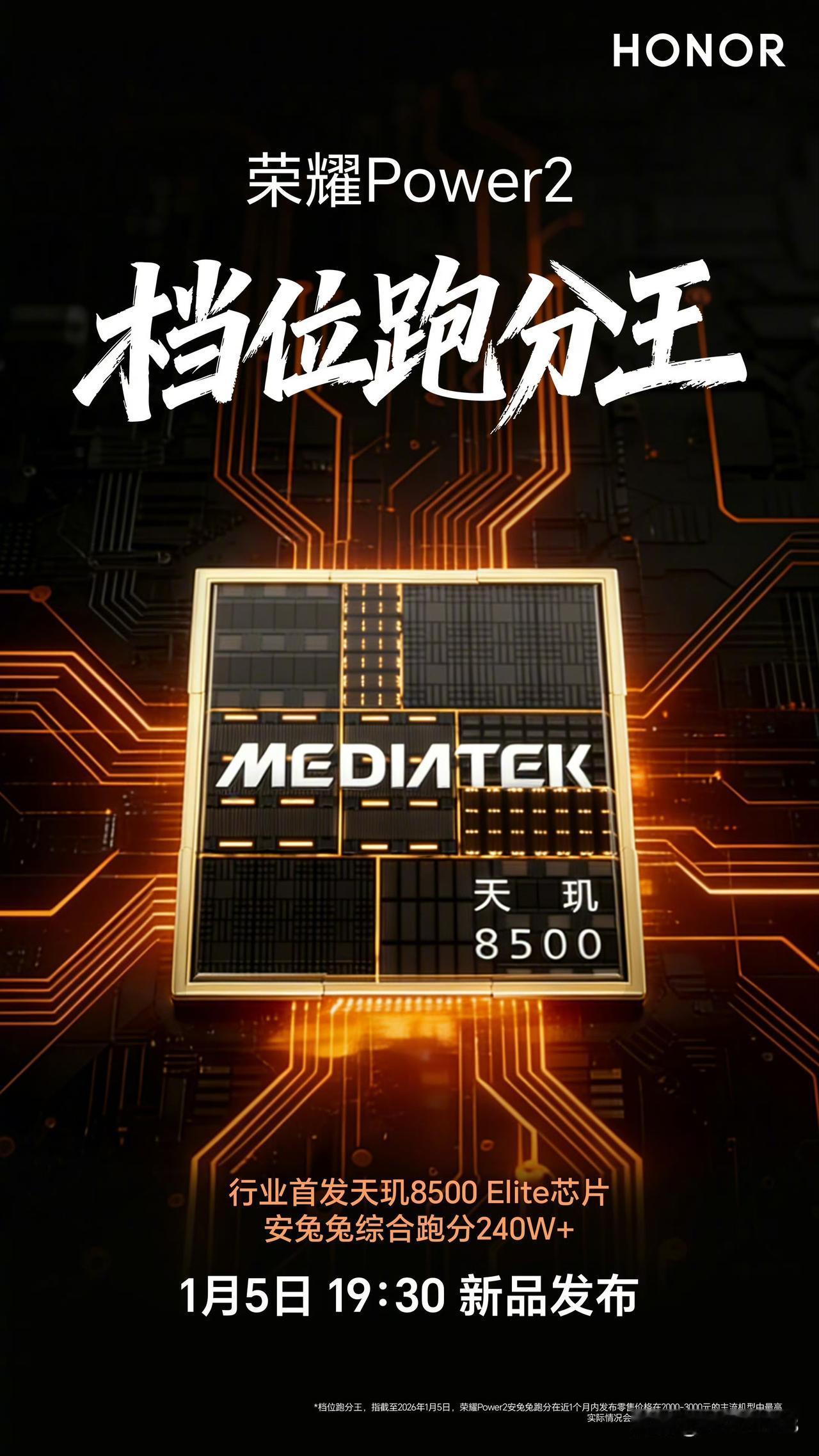 2026 年的第一款新机——荣耀 Power2 明天正式发布,定位户外轻旗舰。 首发联发科天玑 8500 Elite 处理器,支持 IP68 & IP69 & IP69K 防尘防水,第二代荣耀鸿燕通信,10080mAh 青海湖电池,金属中框果味外观,猜猜卖多少钱?[吃瓜群众]