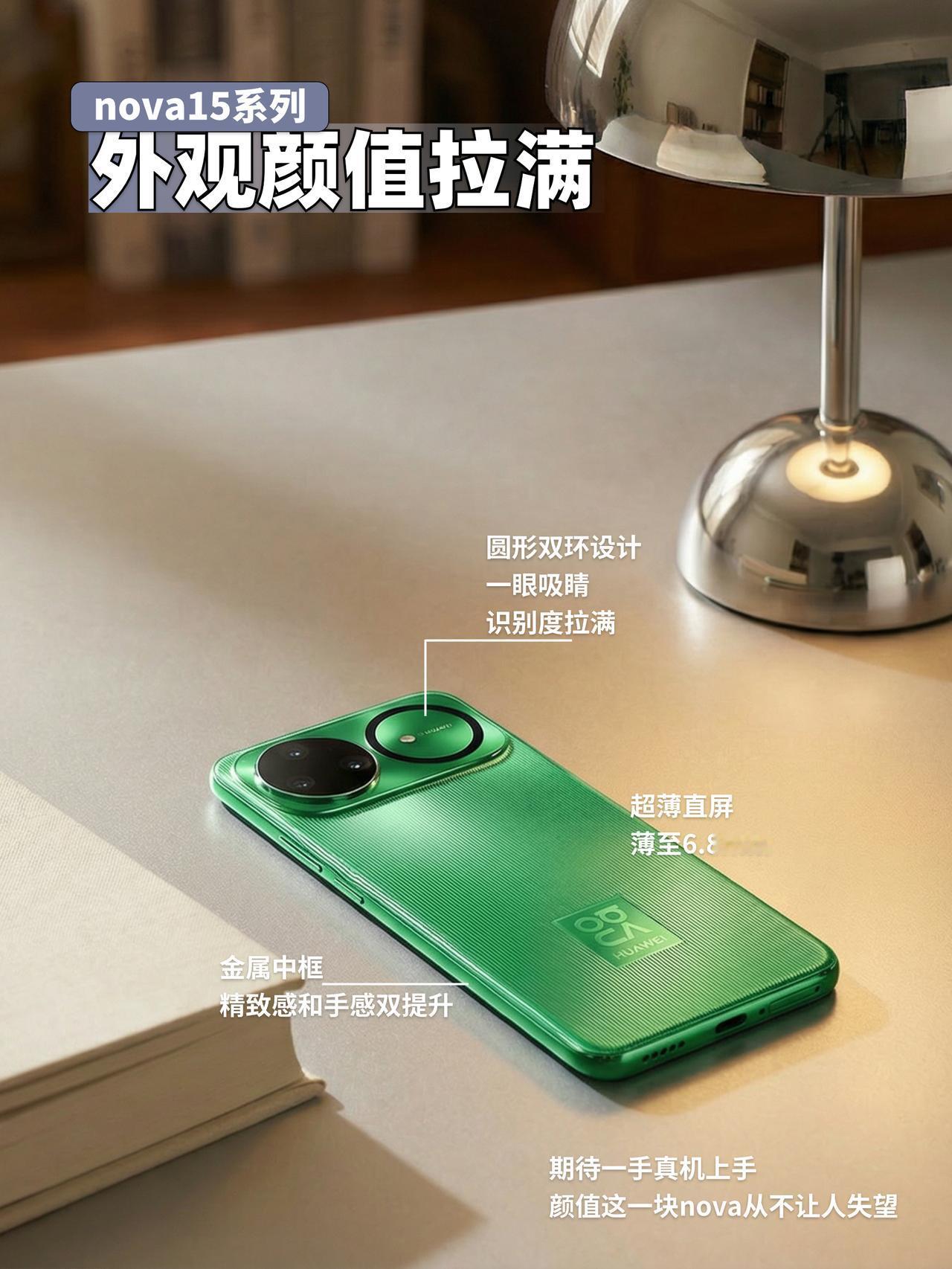 - nova 15系列发布,这次自拍天花板再进化了✨每张自拍都变成写真大片 还能让后置镜头也拥有「nova级」人像美学,这次不止是前置封神,更是全镜头出道!高定颜值,一眼心动 ✅星耀环设计全新升级,光影流转间仿佛手握银河 ✅搭载6.84英寸超动态臻彩护眼屏,4000nit 动态峰值,动态场景视觉张力拉满 ✅铝合金中框加锦纤背板,细腻金属质感搭配流畅线条,颜值手感双绝 - 影像革命|前后双5000万,全面进入「人像大师时代」 ✅「前置天花板再突破」,连红枫镜头都前置了!暗光自拍依然通透奶油肌 ✅「前置独家变焦」0.8X-5X变焦自由切换,特写眼神光、半身氛围感,想要什么都能搞定 ✅「后置广角史诗升级」5000万潜望长焦镜头来袭!从此合影、风景、建筑张张都是海报级画质 ✅「前后双5000万旗舰配置」全焦段高像素,无论前置后置,放大每一寸细节都清晰有质感 - 搭载旗舰影像玩法,年轻人第一台「AI摄影工作室」 ✅「大师同款个性色卡」一键套用电影感色调,周末朋友圈大赛直接赢麻 ✅「AI辅助构图」小白也能随手出片,构图建议实时浮屏,摄影眼秒养成 ✅「一键获取同款大片」看到博主美照?点一下就能智能匹配参数,复刻同款毫无压力 - 出厂搭载鸿蒙6,全能AI生活搭档 ✅「小艺帮帮忙」订机票、搜攻略、写周报…一句话全搞定,你的随身秘书已上线 ✅「AI智感护眼」实时监测你的眨眼频率、累计用眼时长等,精准计算视疲劳程度 ✅「隐私安全全面守护」防窥保护功能主动防护,在别人注视你手机时,除了系统防窥提醒,应用内容也能主动隐藏 - nova 15系列不止是升级——更是人像全场景的重新定义!从前置到后置,从硬件到算法,每一面都惊艳! - nova15 易烊千玺 手机数码