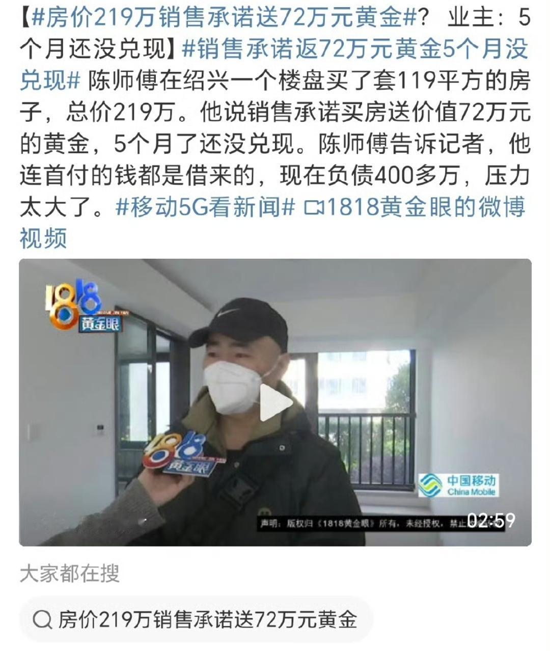 219万买房送72万黄金,相当于房价直接打6.7折,这“天上掉金条”的诱惑谁看了不心动? 可绍兴陈师傅的遭遇直接给所有人泼了冷水——借钱凑首付、背上400多万负债,苦等5个月连黄金影子都没见着,销售只剩“走流程”“等审批”的敷衍话术。 其实这早就不是孤例,深圳、杭州等多个城市都出现过“买房送黄金”的促销,有的喊着送1公斤黄金,有的按户型送数百克,背后要么是纯粹“画大饼”的口头诱导,要么是虚增合同价套取贷款的违规操作。 更坑的是,这类承诺大多不写入购房合同,真要维权,消费者举证难、耗时久,最后往往得不偿失。 现在国内金价979、国际4332,加上高盛预测2026年金价可能涨到4900美元/盎司,黄金确实成了热门标的。 但大家会为了“送黄金”的噱头冲动买房吗?你身边有没有遇到过“送装修”“返现”等类似促销套路?到底该怎么甄别开发商的优惠是否靠谱?黄金买房 黄金完爆房产 销售 套路